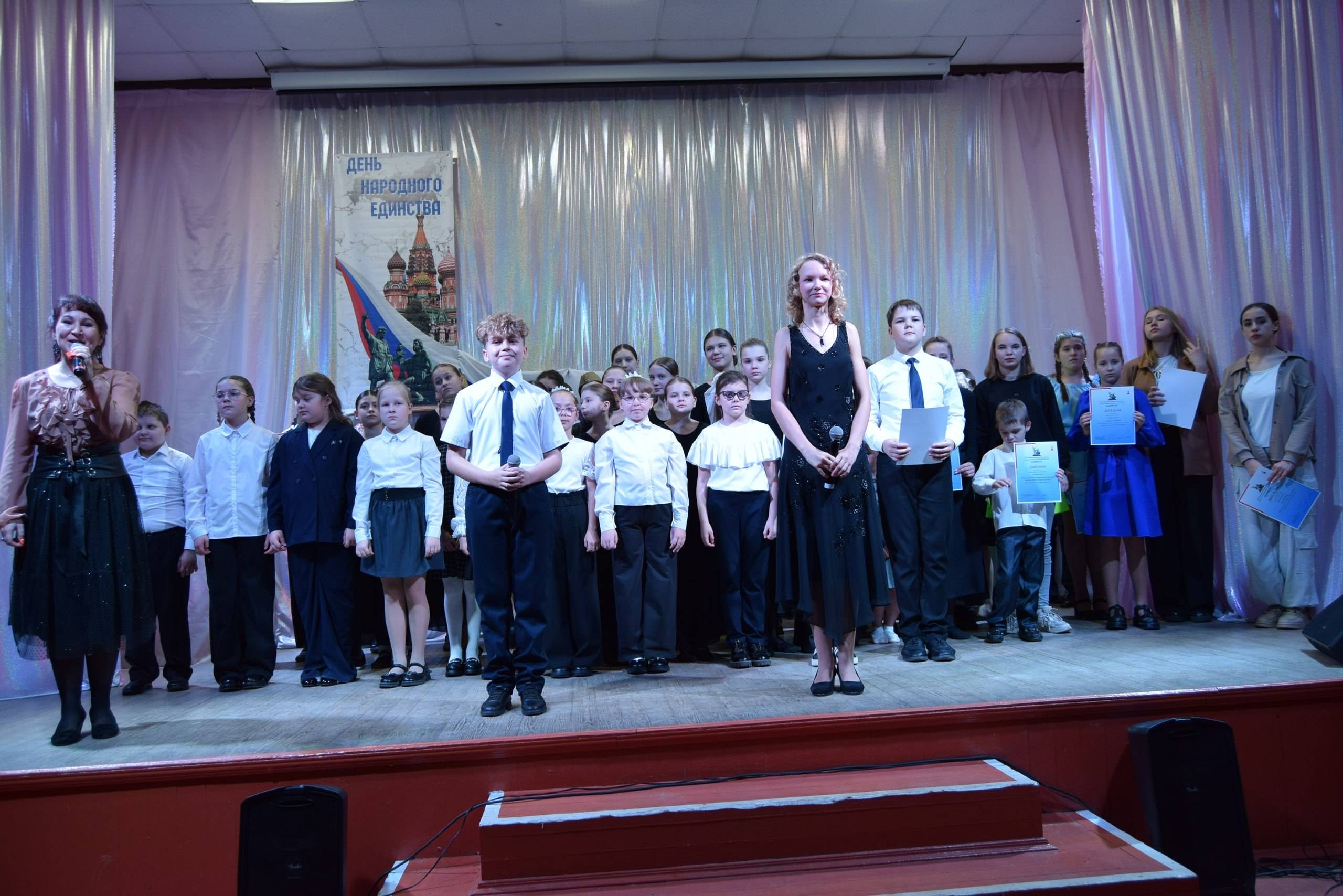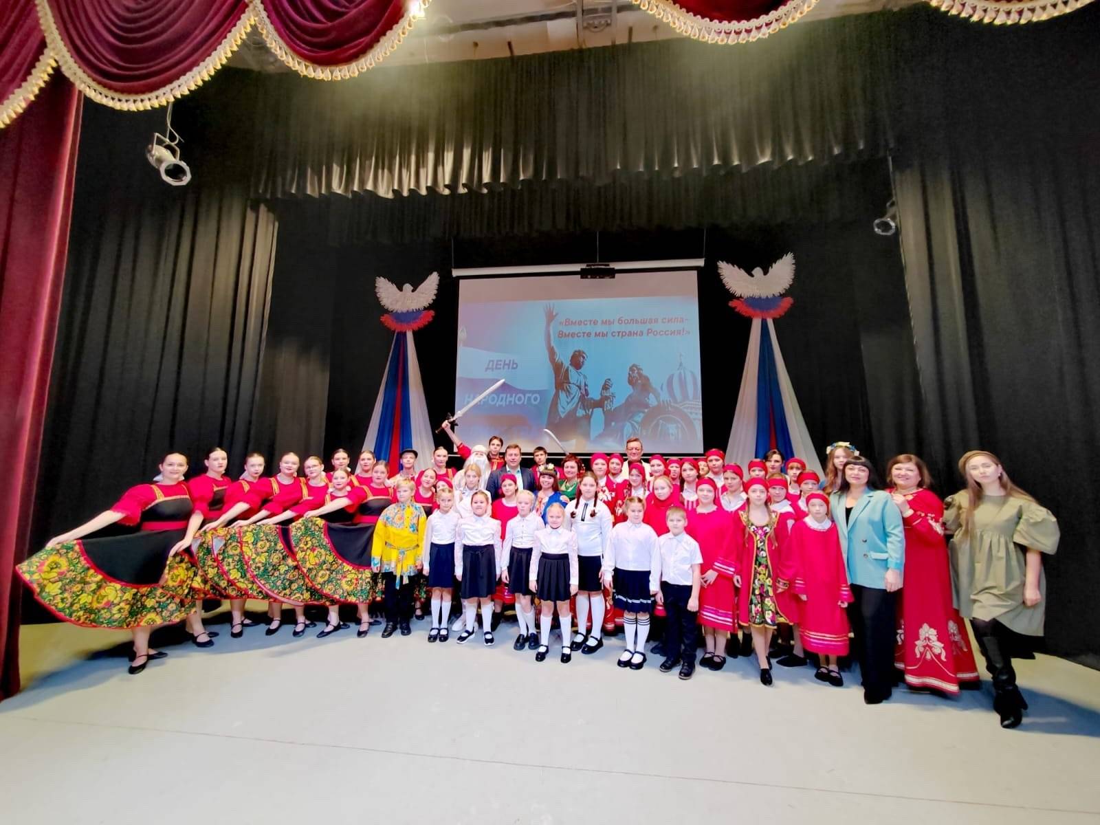 В Весьегонске 4 ноября в ЦДК прошел праздничный концерт ко Дню народного единства. В программе участвовали коллективы Дома культуры и учащиеся школ. Звучали тематические вокальные номера, инструментальные композиции и хореографические постановки, посвященные истории и людям Тверского края. Зал собрал жителей разных возрастов.