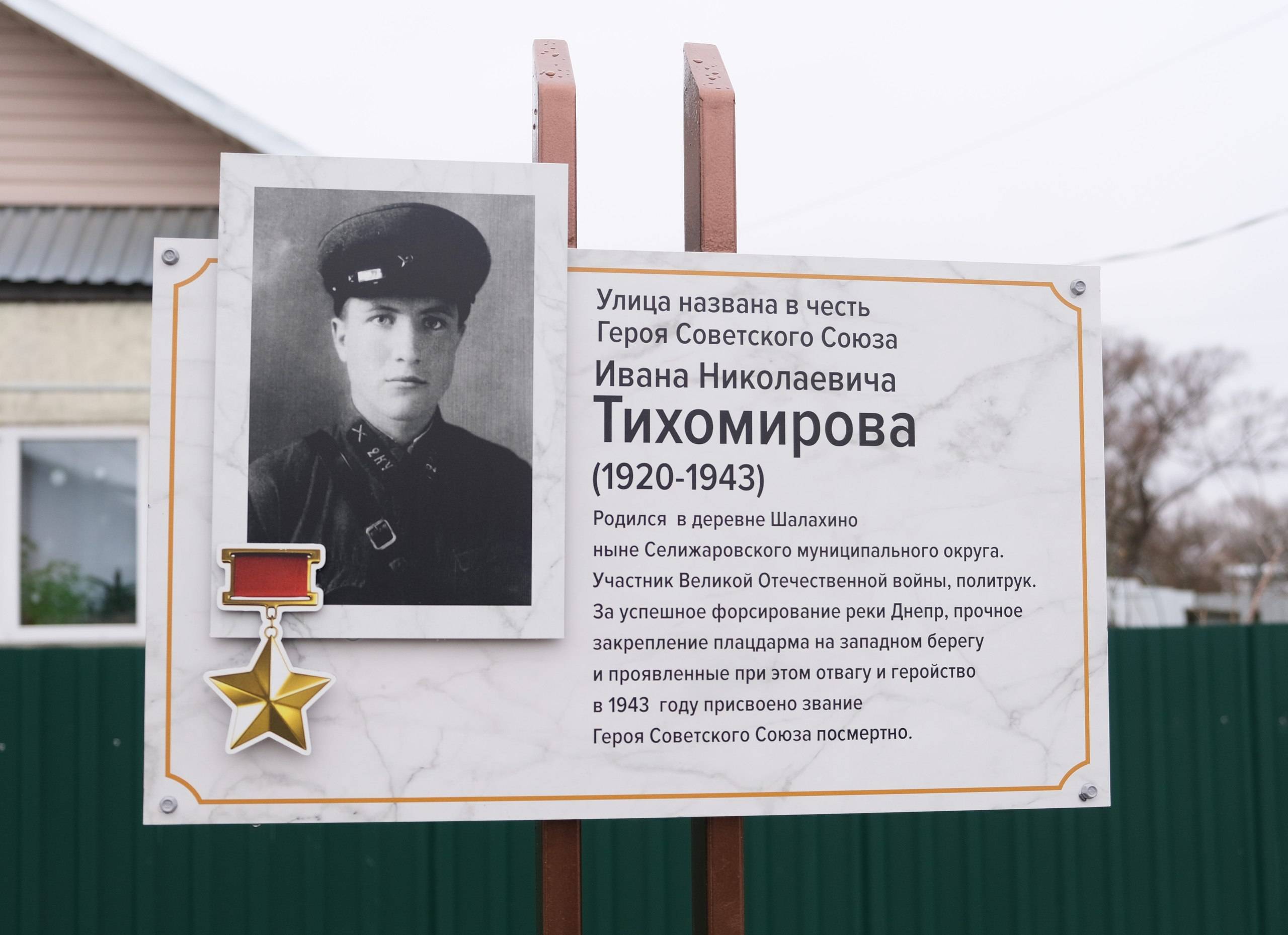 На улице Тихомирова установлена информационная табличка с краткой биографией и фотографией героя. Теперь они есть в нашем посёлке на пяти улицах, носящих имена Героев Советского Союза.