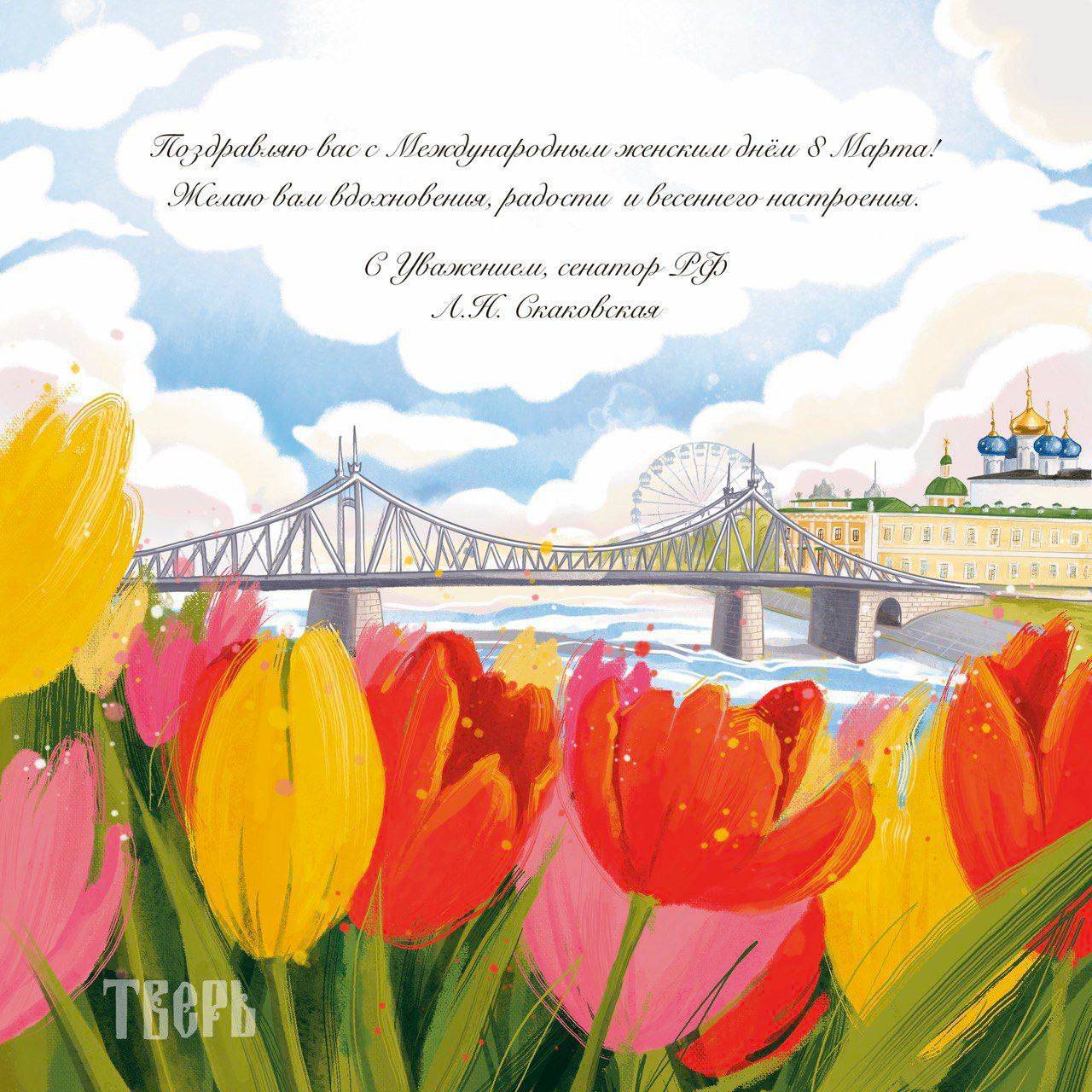 Сенатор РФ, Заместитель председателя Комитета Совета Федерации по науке, образованию и культуре, Председатель Тверского регионального отделения Российского военно-исторического общества Людмила Скаковская обратилась к женщинам Тверской области с глубокими и теплыми словами поздравления по случаю 8 Марта. В этот важный день, призванный отметить вклад женщин в развитие общества, сенатор подчеркнула бесценную роль женщин в истории.
