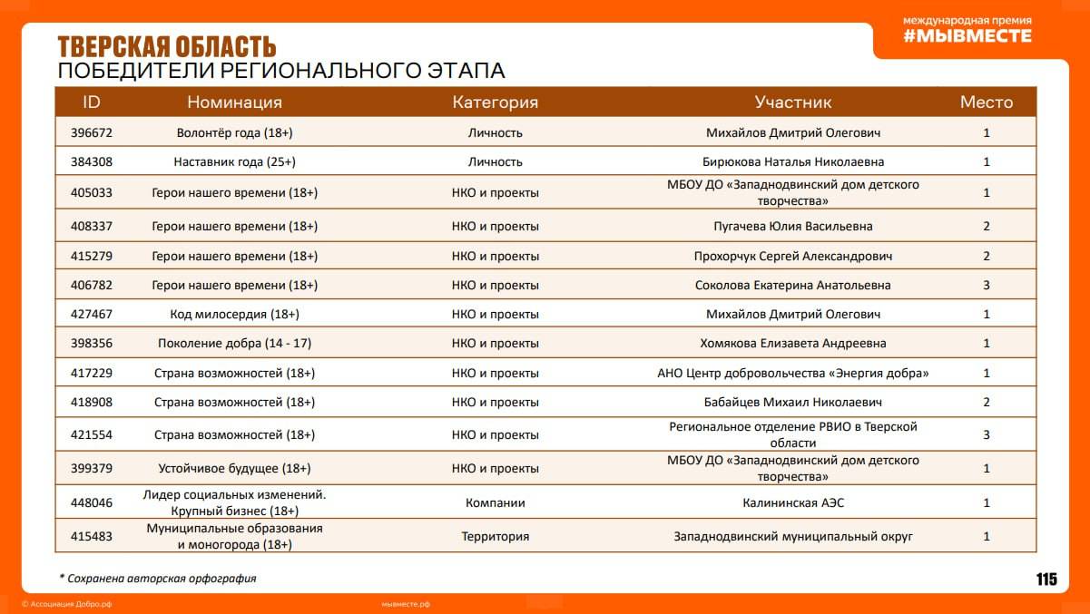 В этом году премия получила исторический отклик: подано 51 837 заявок из 147 стран мира — почти на 50% больше, чем год назад. Форум "Земляки – защитники Родины" от тверского отделения РВИО вошёл в число 1313 лучших региональных проектов страны.