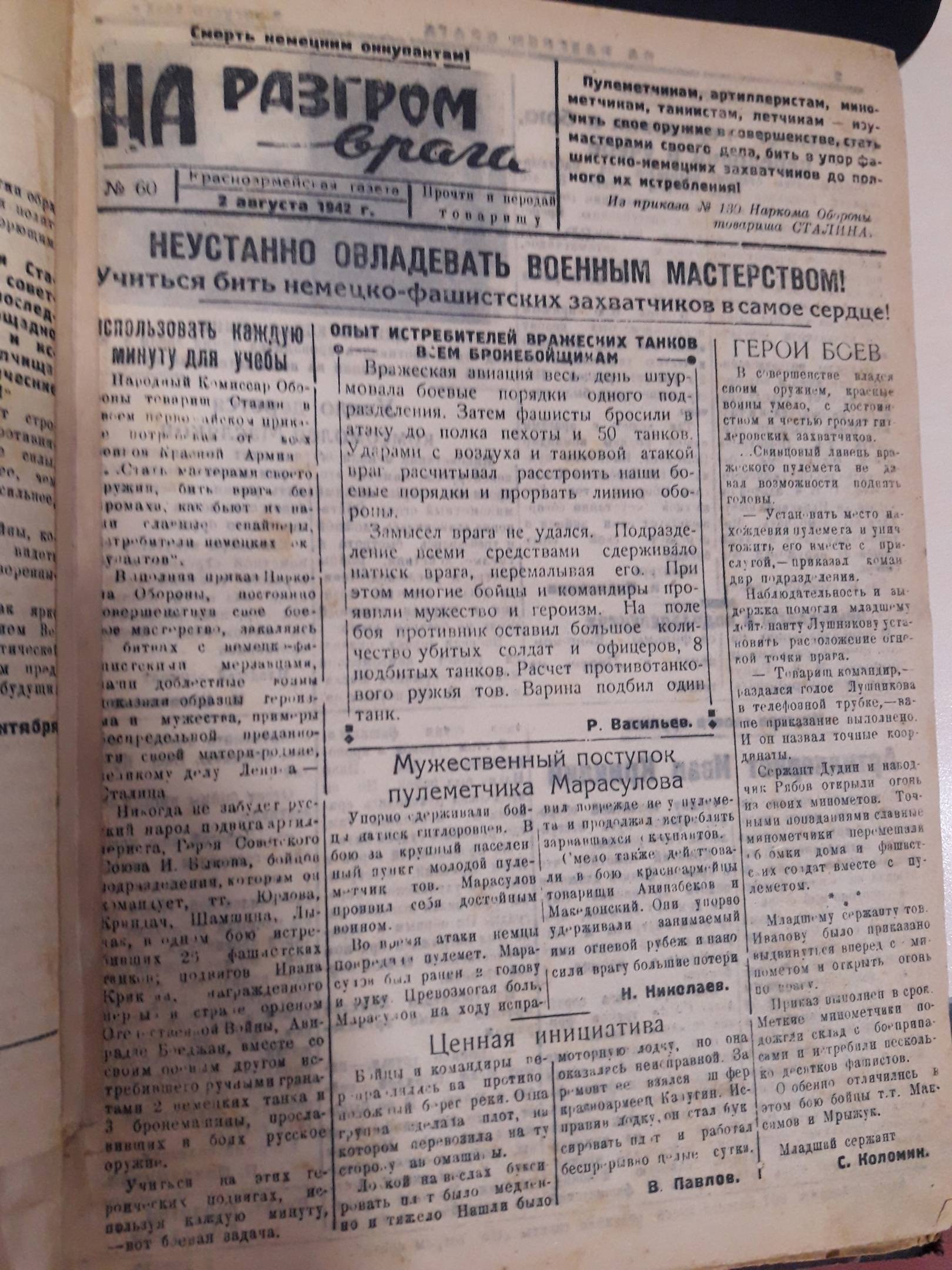Газета выпускалась во время Великой Отечественной войны для 907 полевой почты и включает выпуски с 2 августа 1942 года по 24 марта 1943 года. Среди номеров: специальный выпуск «Смерть немецким оккупантам!» с заголовком «Отстоим Сталинград!» и статья Г. Александрова «Бои за Сталинград», опубликованная в газете «Правда» 21 октября 1942 года.