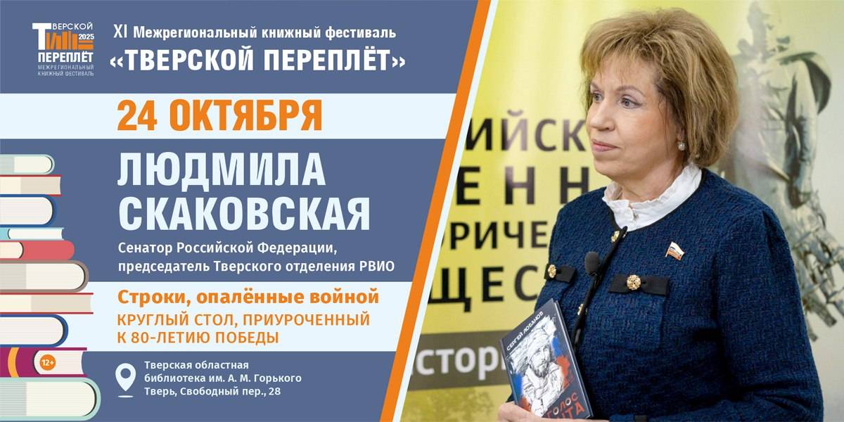 Тверское региональное отделение Российского военно-исторического общества приглашает на круглый стол «Строки, опалённые войной». Мероприятие, приуроченное к 80-летию Победы, пройдёт 24 октября с 15:00 до 16:30 в Славянском зале областной библиотеки им. А.М. Горького в ходе книжного фестиваля «Тверской переплёт».