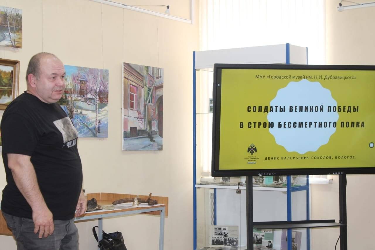 В городском музее накануне Дня памяти и скорби прошло мероприятие, посвящённое началу Великой Отечественной войны. Соколов Денис Валерьевич, председатель бологовского отделения Тверского регионального отделения Российского военно-исторического общества, сообщил о результатах архивно-поисковой работы, проведённой совместно с поисковым отрядом, и выразил благодарность участникам конкурса "Солдаты Великой Победы" за вклад в сохранение исторической памяти.