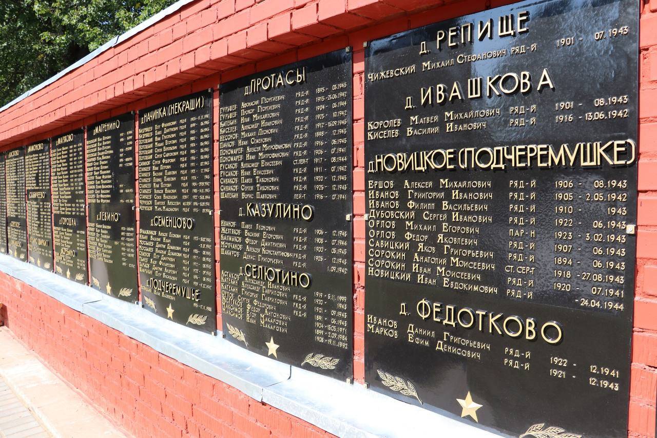 На Стене Памяти увековечены 243 фамилии и названия больше десятка деревень, откуда ушли на фронт защитники Отечества, которые в мирное время были сельскими тружениками.