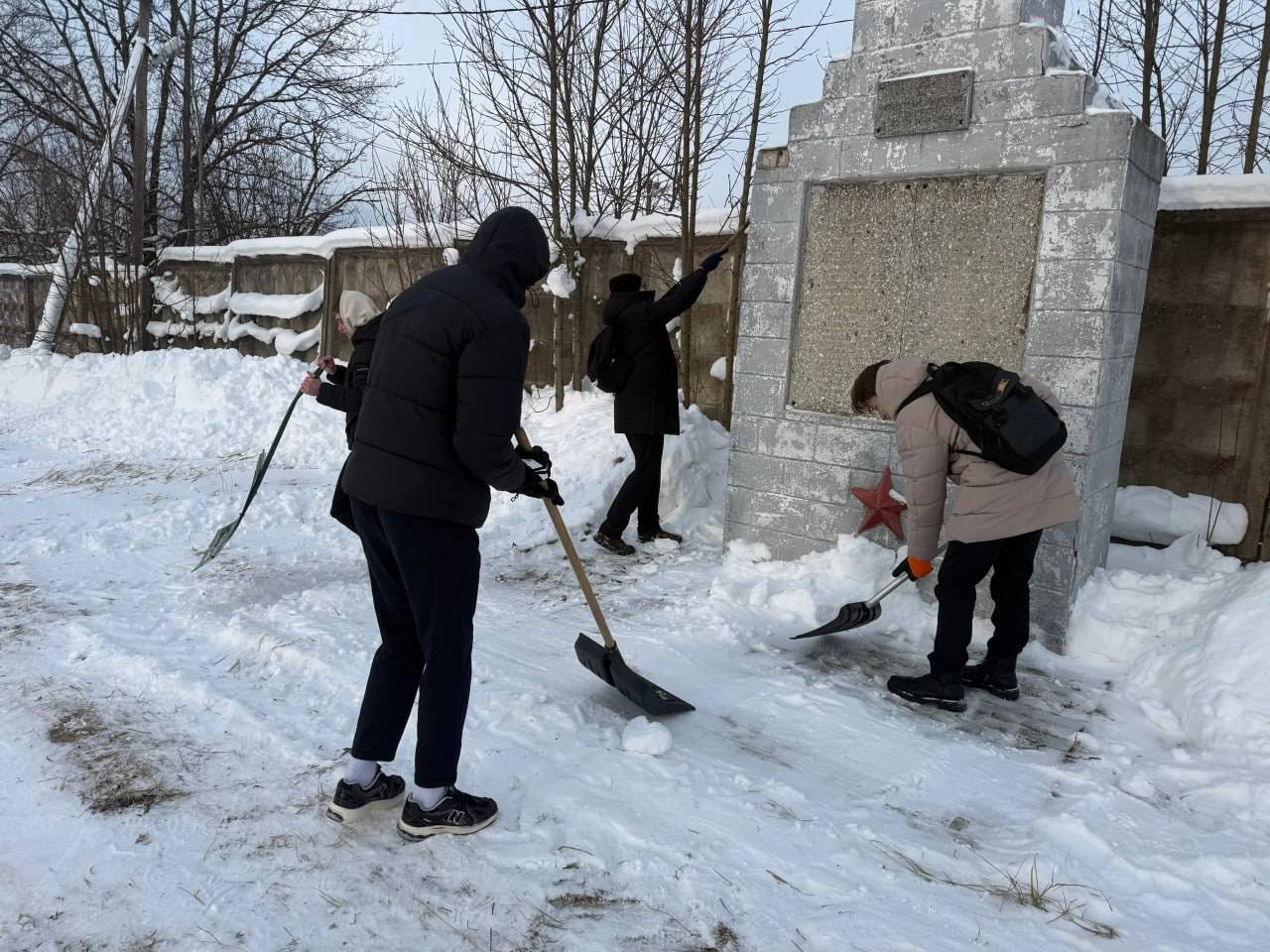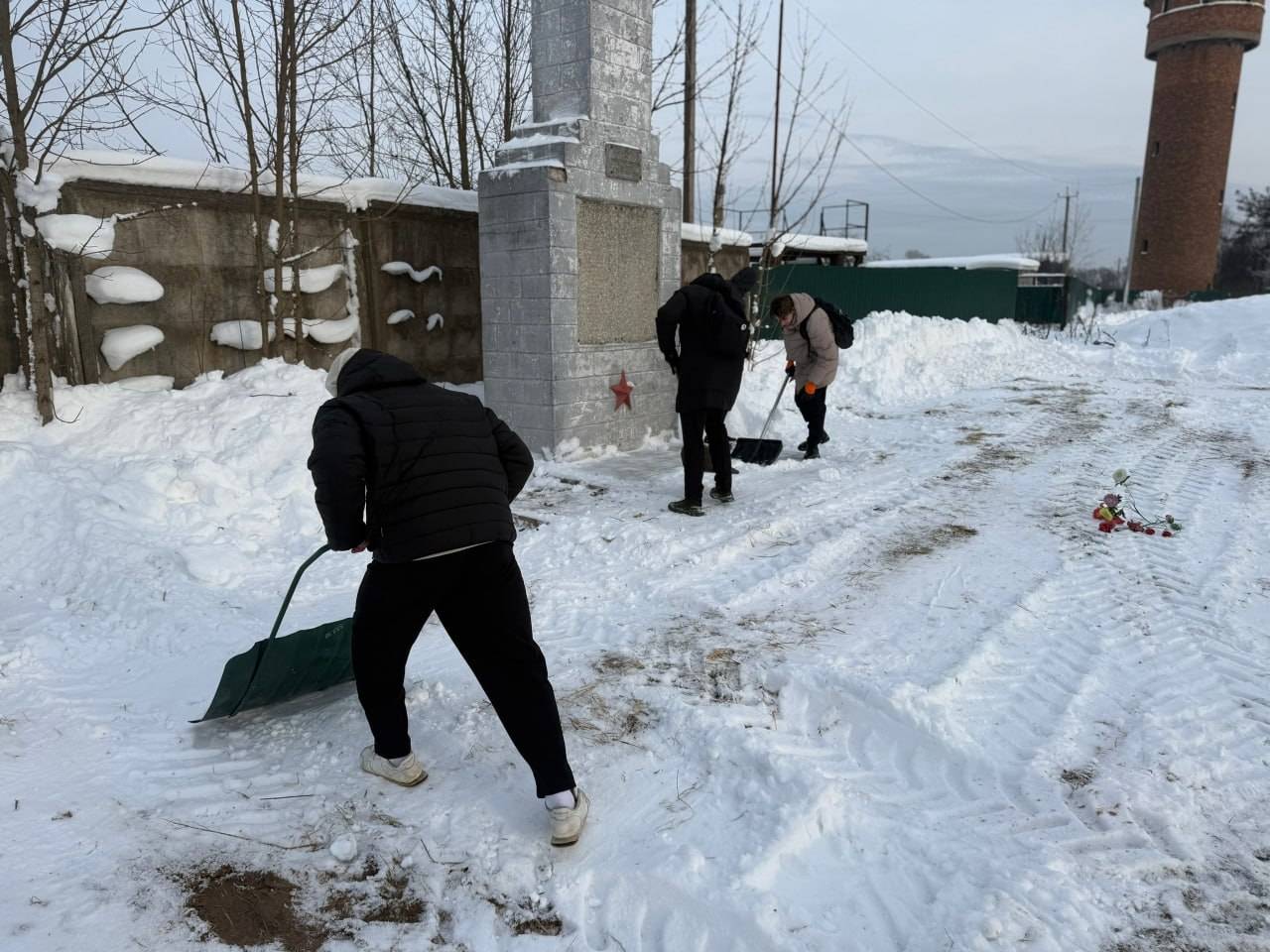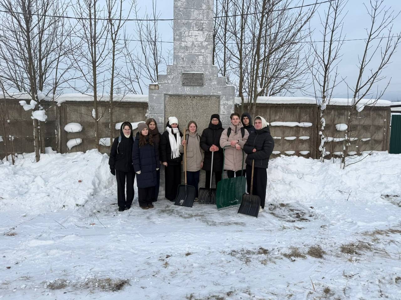 Ребята дружно убрали снег с дорожки, которая ведет к памятнику, территорию вокруг, освободили от снега сам памятник.