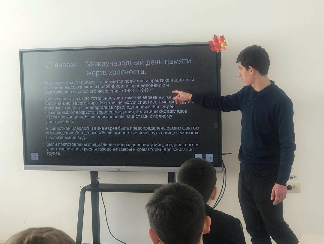 с 5 – го по 11 – ые классы . В 6 – 8 – х классах учитель истории Шибзухов И. А. рассказал про преследование и массовое уничтожение евреев гитлеровцами во время Второй мировой войны. Были вскрыты вероятные причины мстительности по отношению к еврейскому населению.