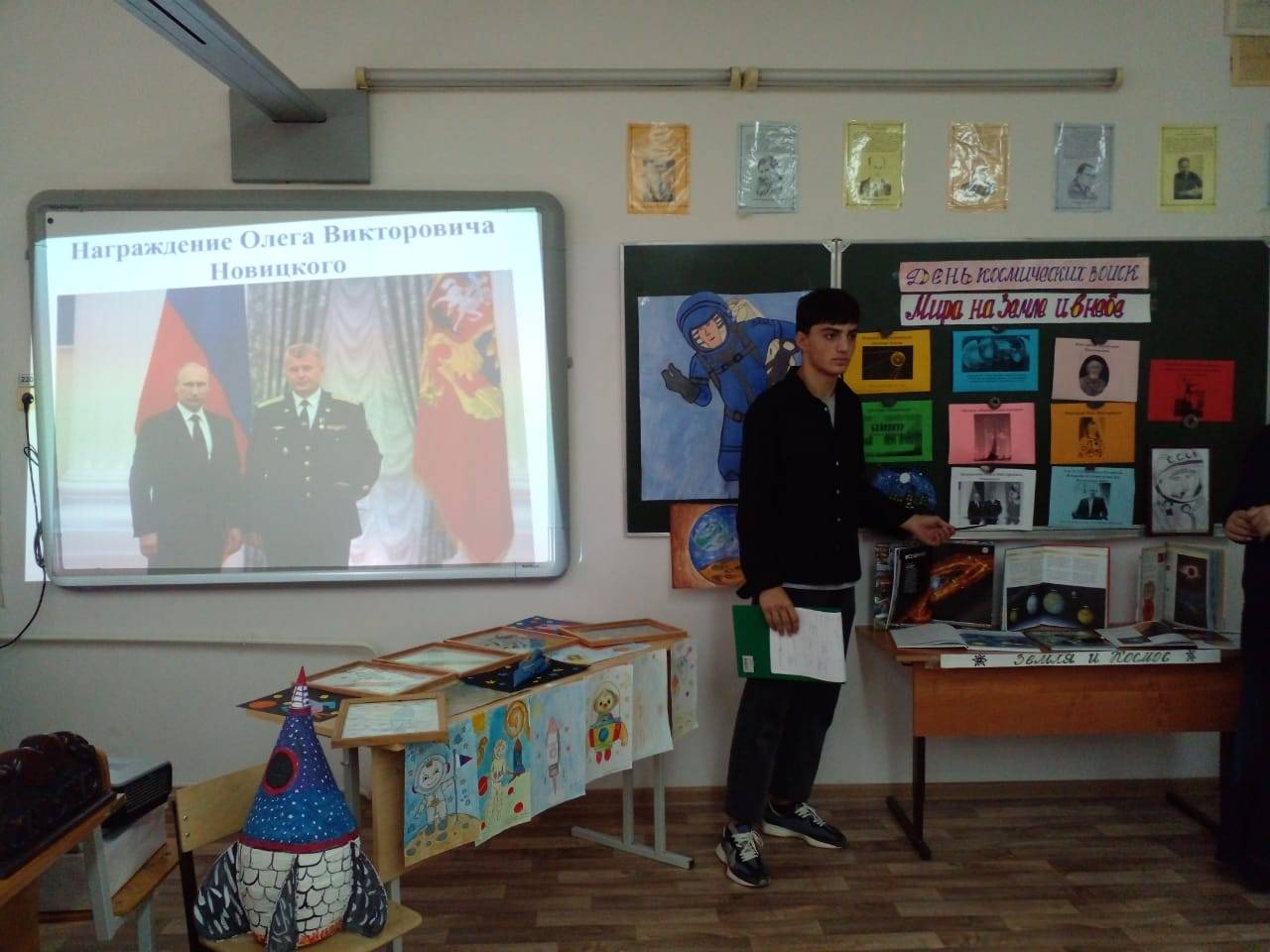В МКОУ СОШ с.п. Псыкод состоялся информационно – познавательный час ко Дню Космических войск по теме : «Мир на Земле и в небе». Этот праздник ежегодно отмечается 4 октября в космических войсках России Профессиональный праздник космических войск учреждён Указом Президента РФ от 31 мая 2000 года.