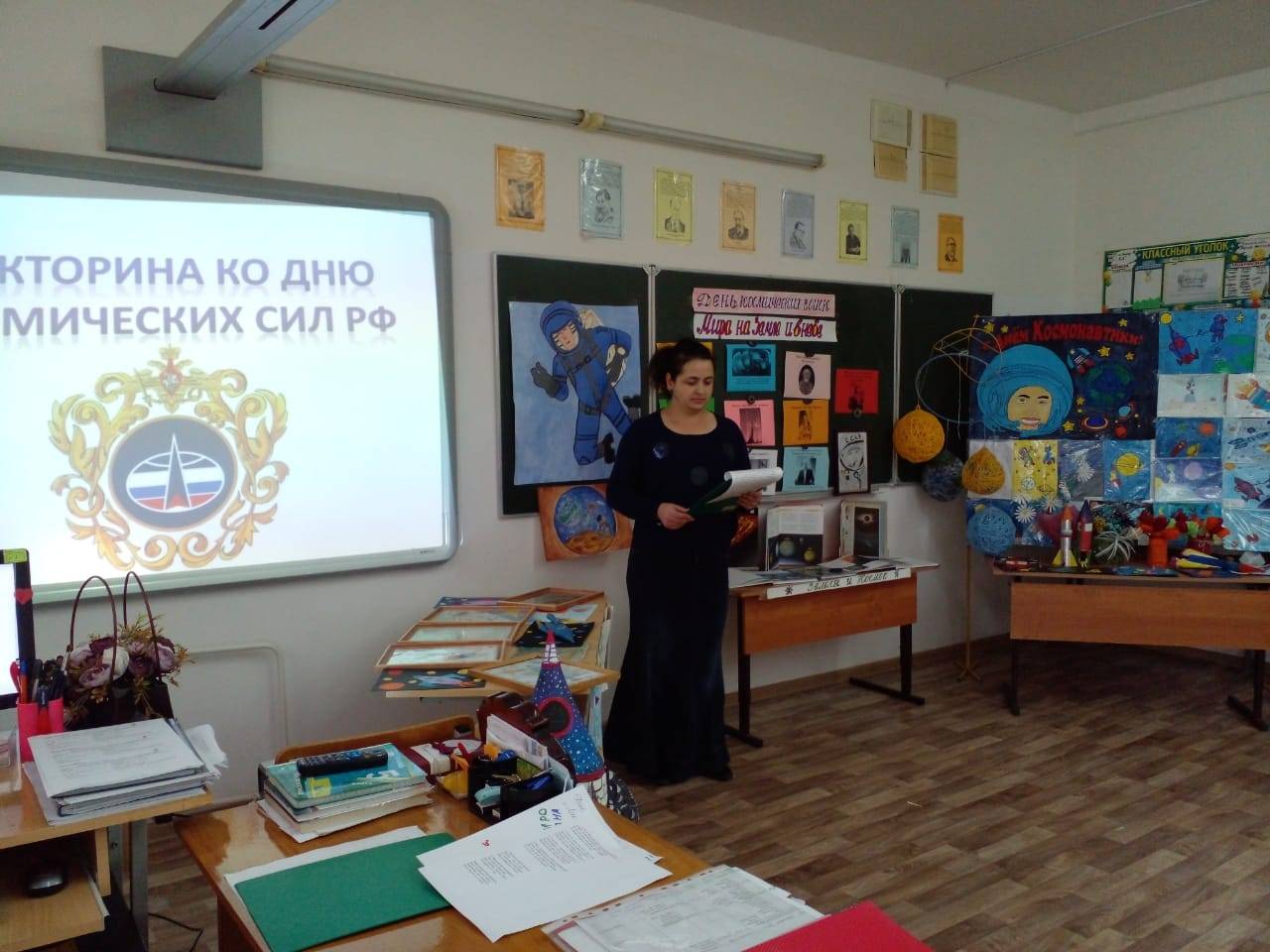 Праздник приурочен ко дню запуска первого искусственного спутника Земли. К этому дню активно подготовились и в Псыкодской школе. Зав. МКУК сельской библиотекой Тхагалегова Марьяна Анатольевна провела открытое мероприятие , в котором участвовали учащиеся 7 – 9 – х классов. В рамках мероприятия проведены : конкурс рисунков , конкурс плакатов и макетов ,турнир знатоков на лучшее знание по истории космических войск.