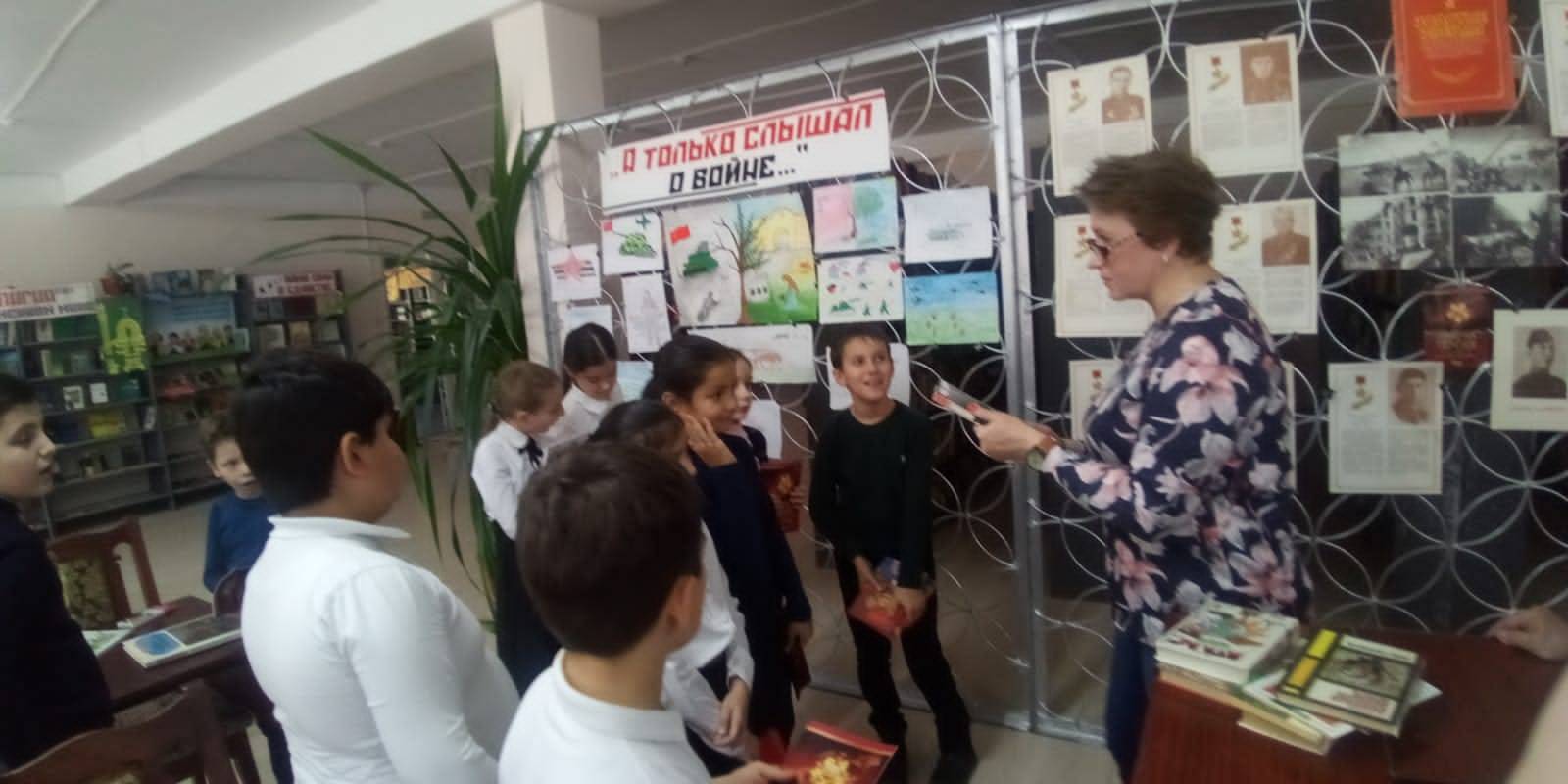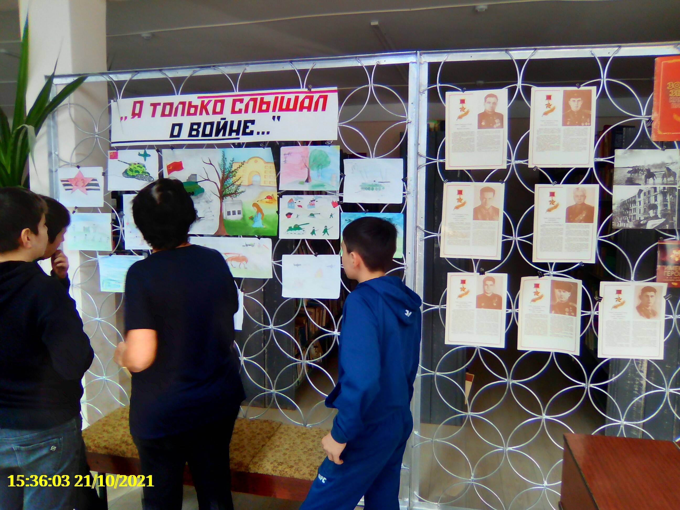 В начале конкурса был проведен обзор у книжно-илл. выставки: «И память о войне нам книга оставляет», организованной для младшего и среднего школьного возраста. Ребята выбрали книги и под впечатлениями от прочитанного нарисовали рисунки, в которых отразили своё отношение к событиям военной поры.