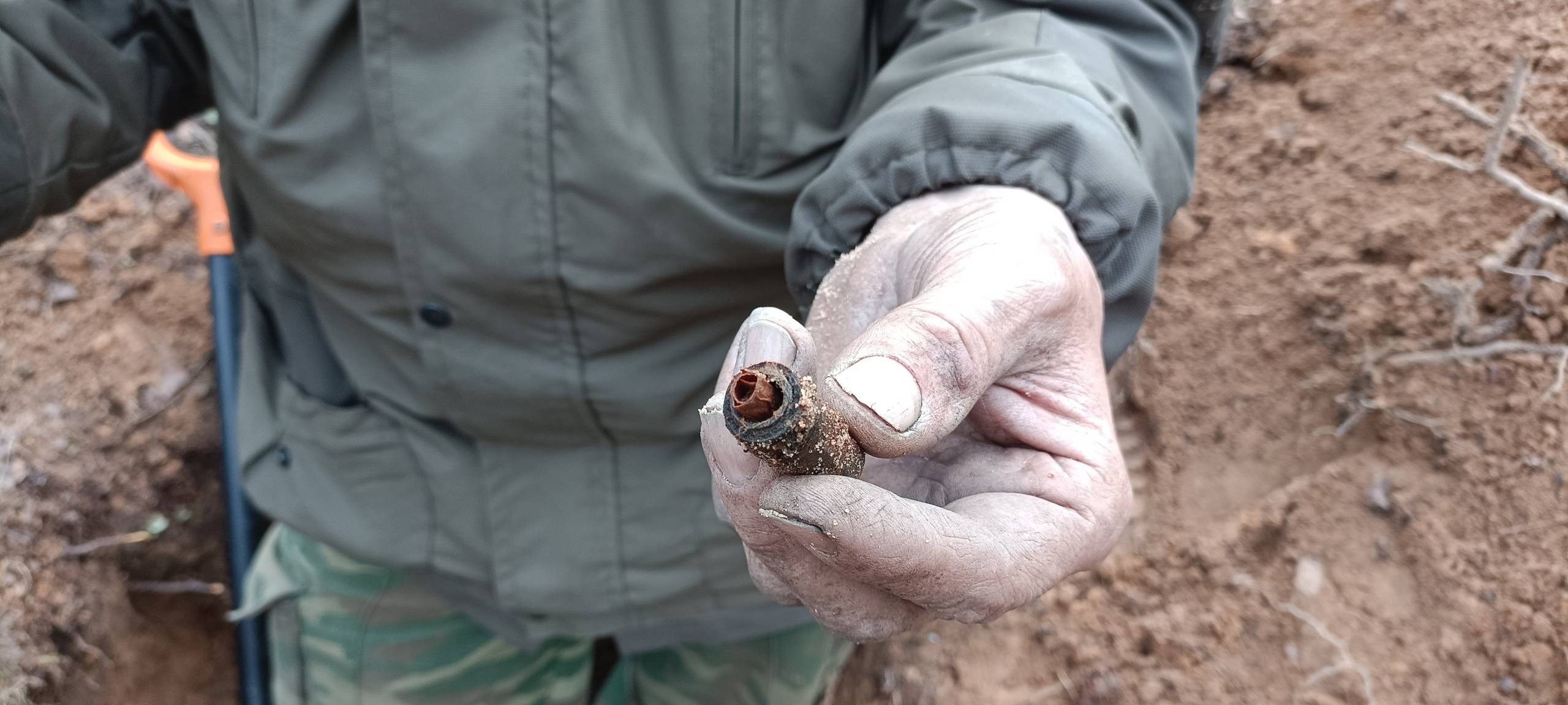 Останки находились на глубине около 70 см., практически на обочине старой дороги. Судя по характерным для минно-фугасных травм повреждениям (множественные осколочные ранения нижних конечностей с раздроблениями костей) боец погиб от близкого разрыва артиллерийского боеприпаса.