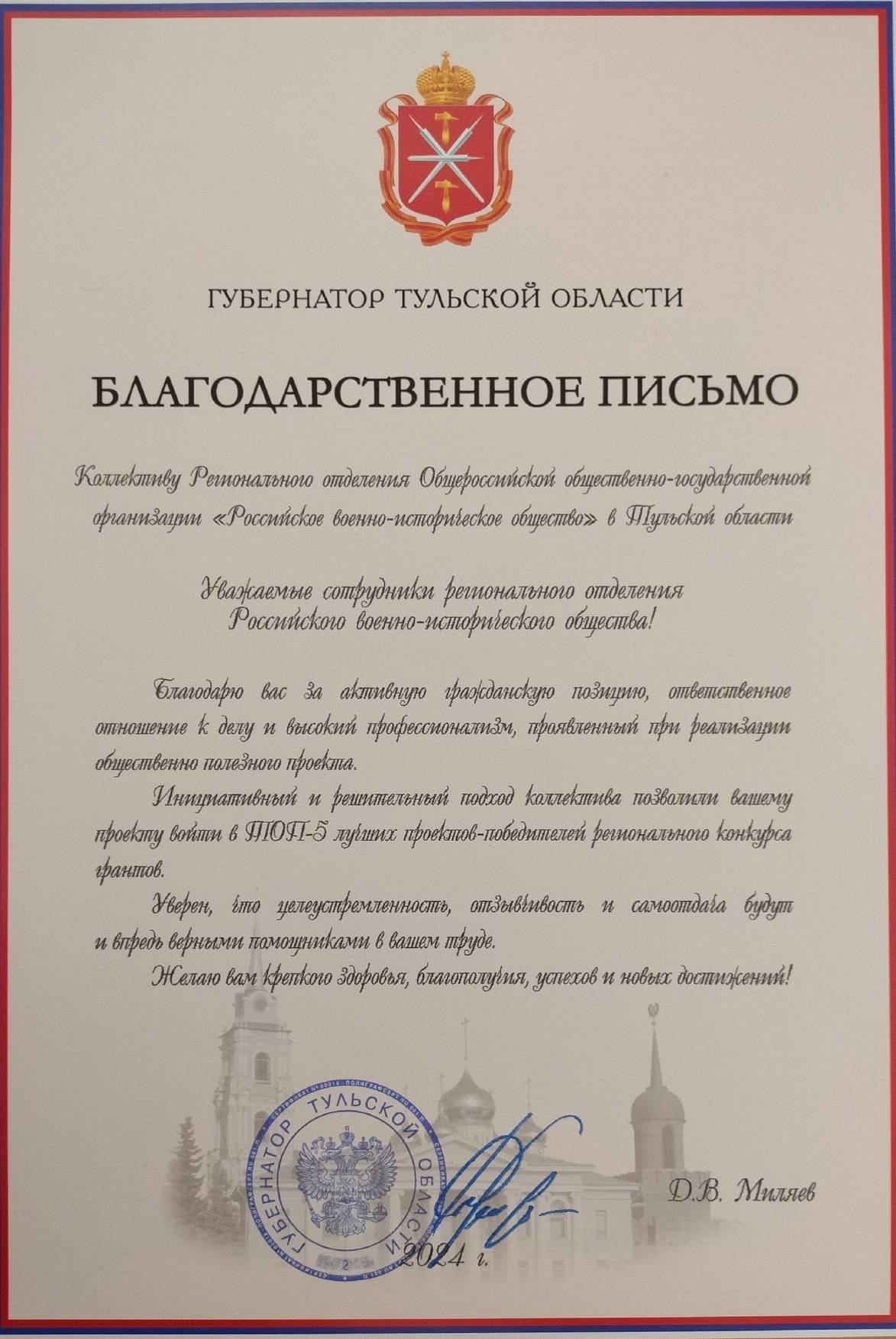 За активную гражданскую позицию, ответственное отношение к делу и высокий профессионализм, проявленный при реализации общественно полезного проекта, коллективу Тульского регионального отделения Российского военно-исторического общества было вручено Благодарственное письмо Губернатора Тульской области. Алексей Давлетшин вручил эту награду Председателю РО РВИО Александру Потапенко.