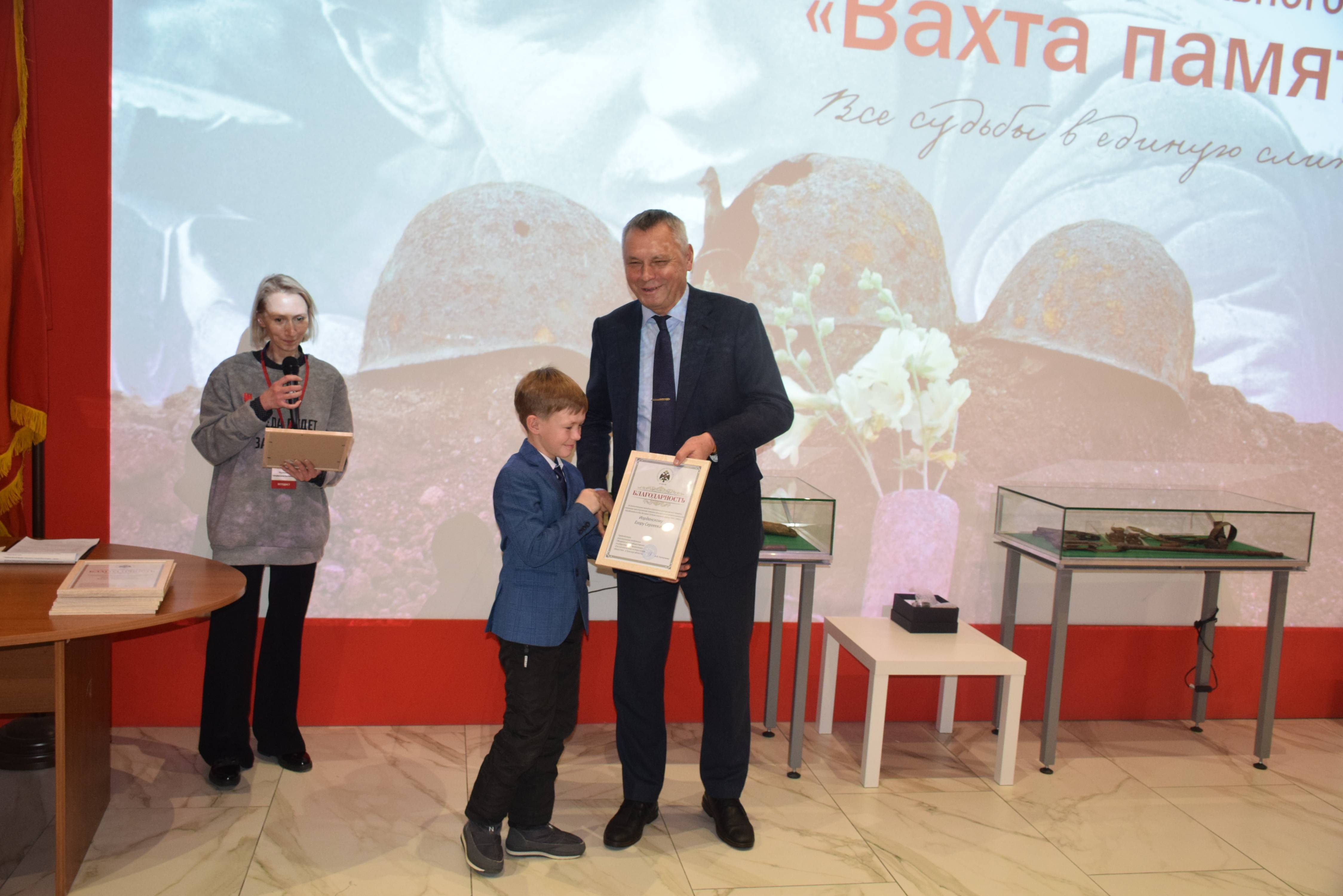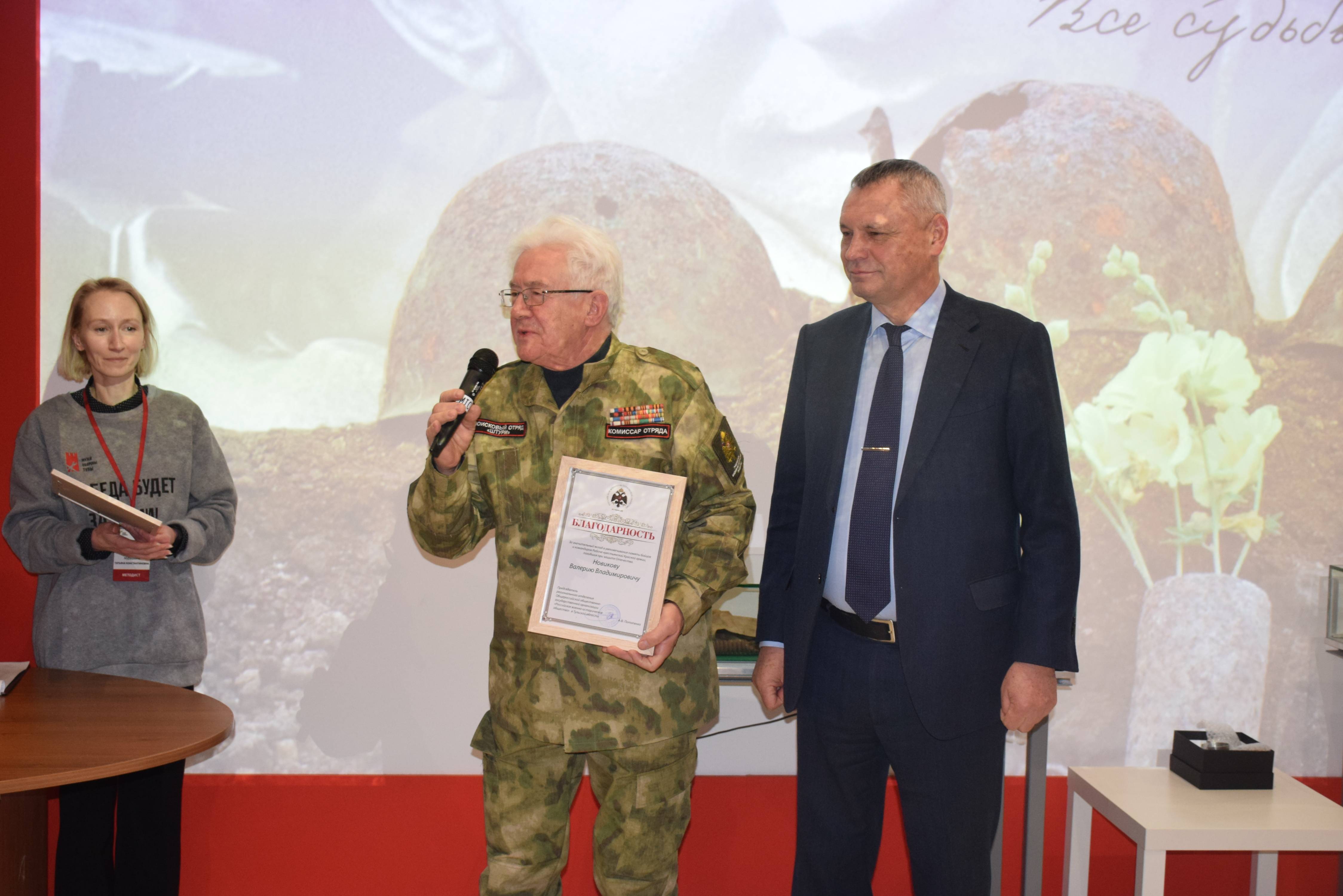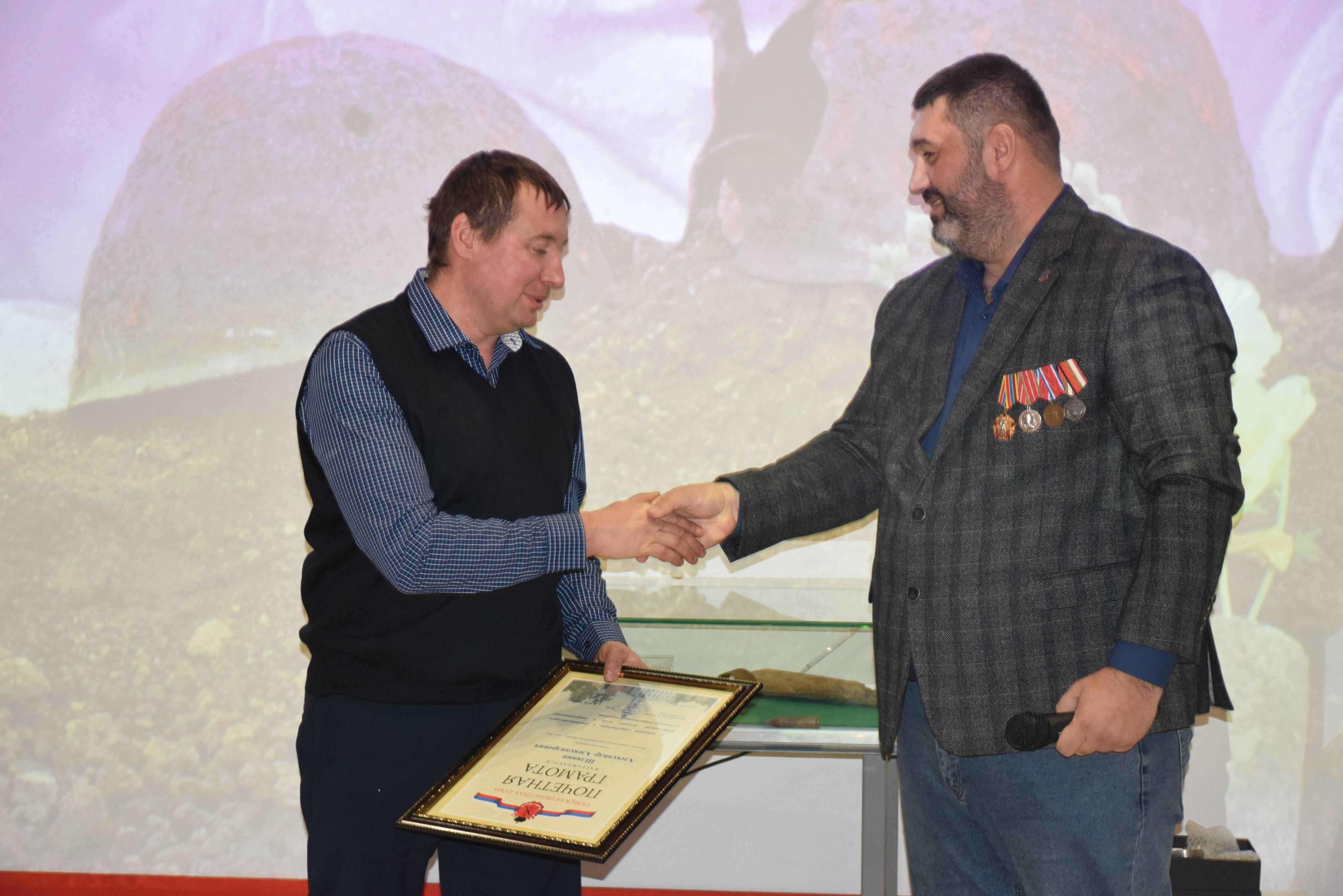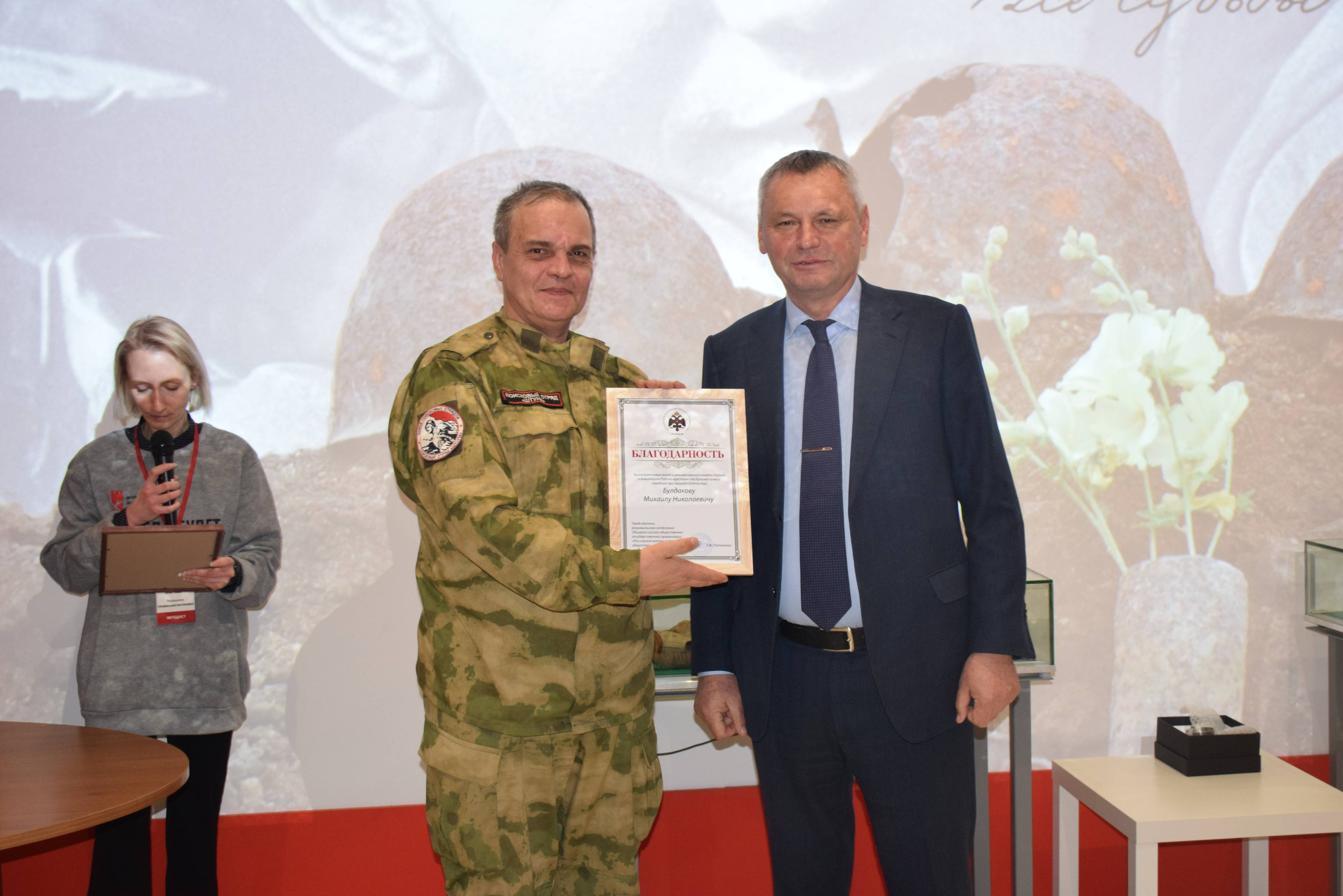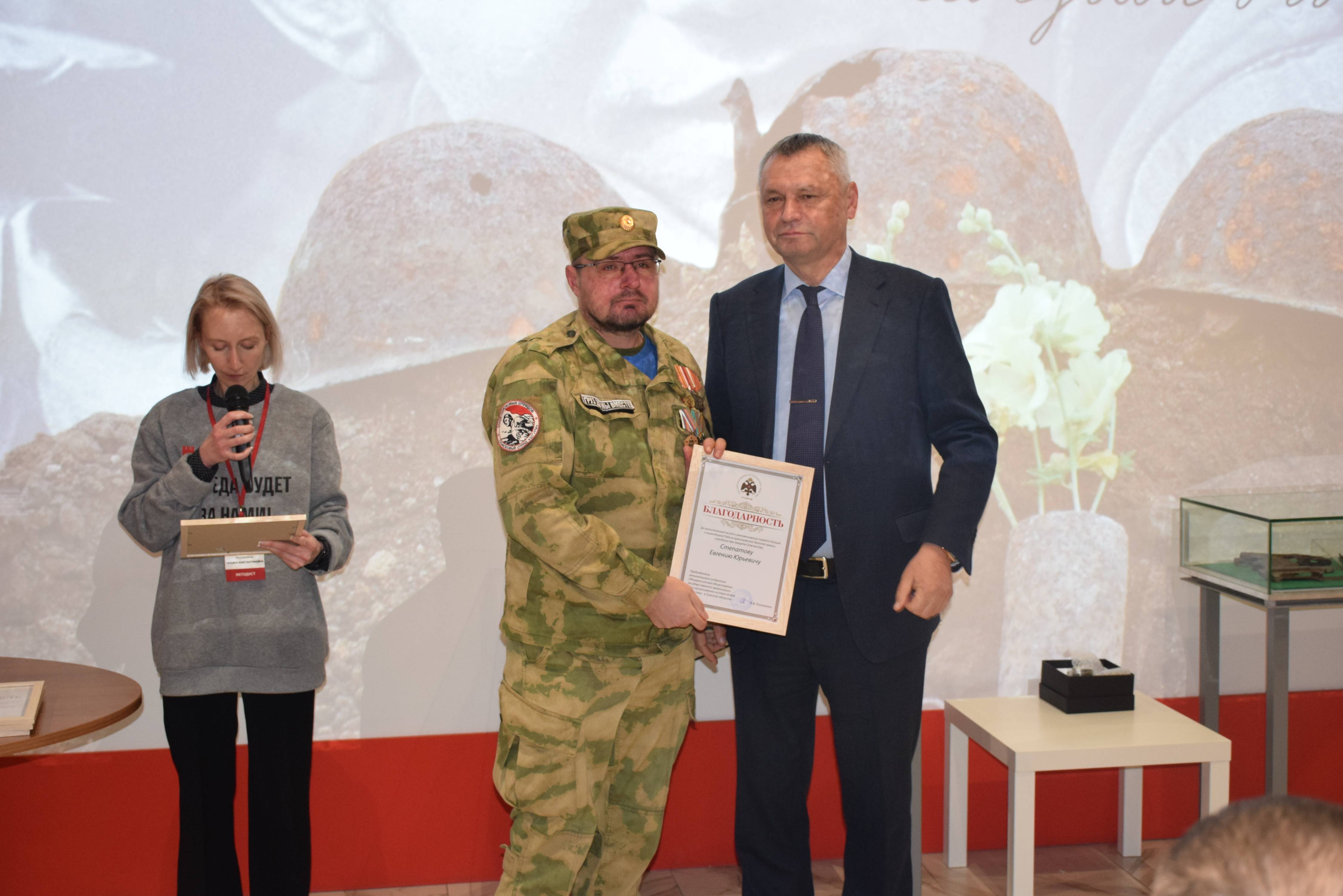 Председатель Тульского регионального отделения РВИО Александр Потапенко и Константин Ферапонтов вручили наиболее отличившимся поисковикам памятные награды, значки и благодарности от Российского военно-исторического общества и Поискового движения России.