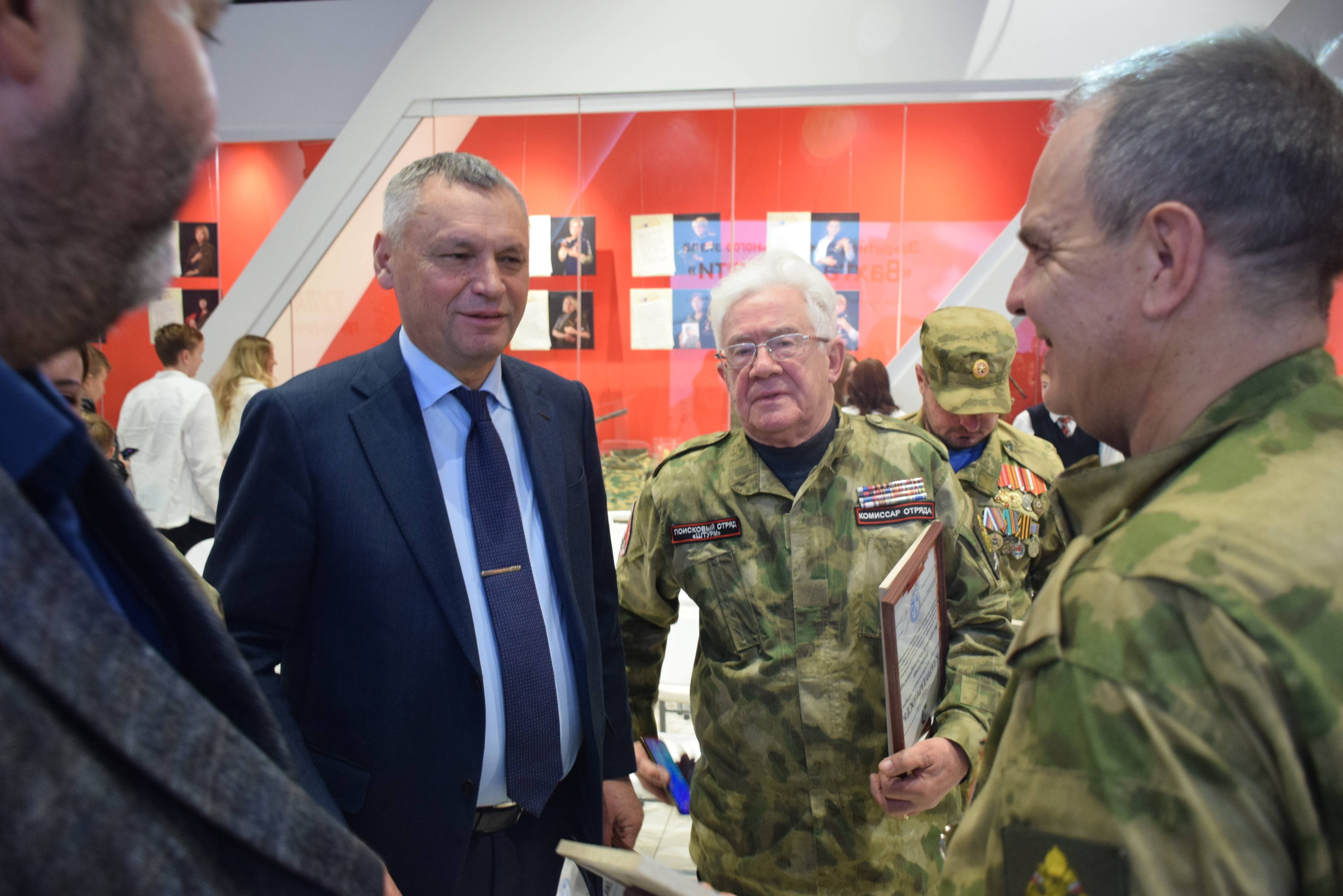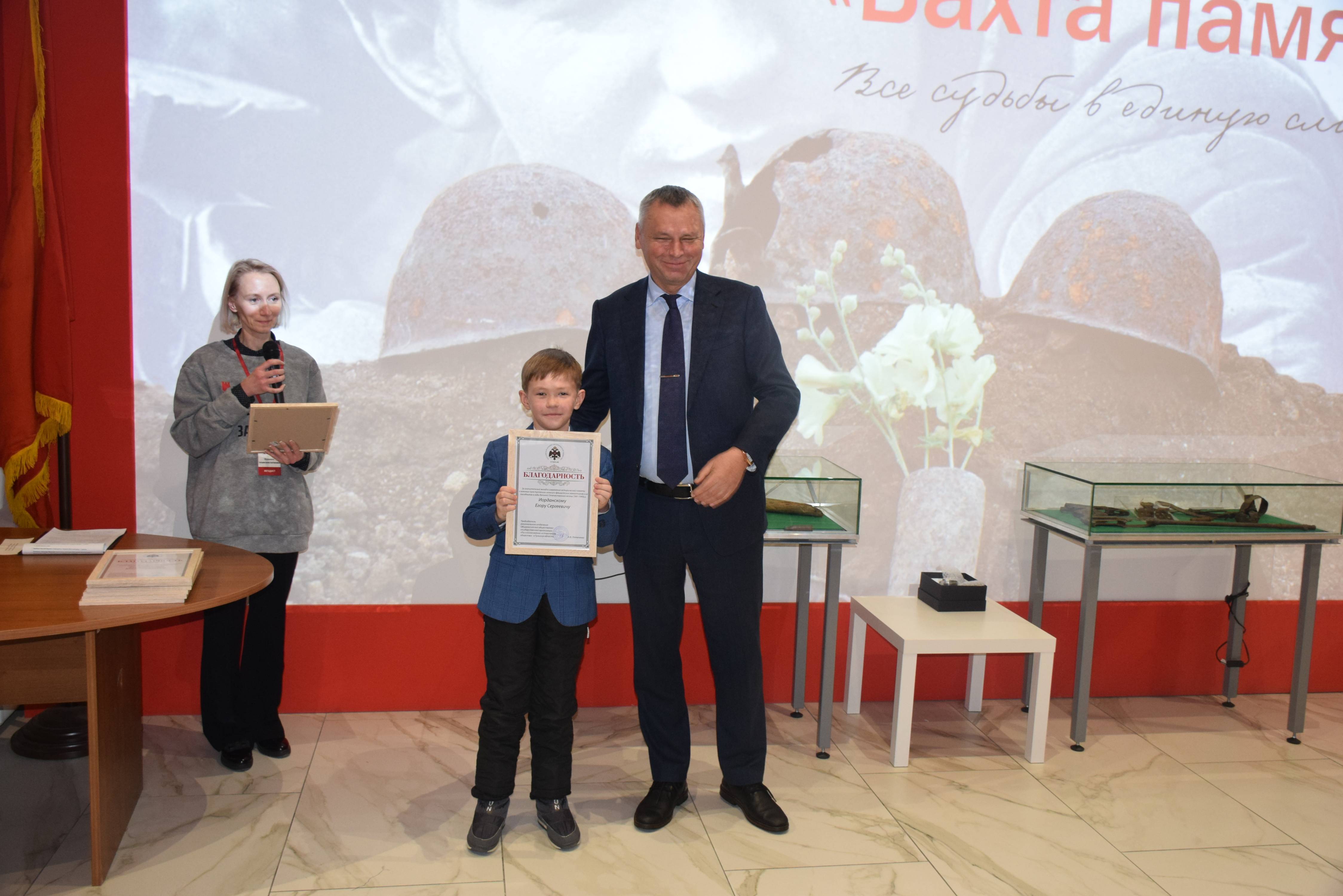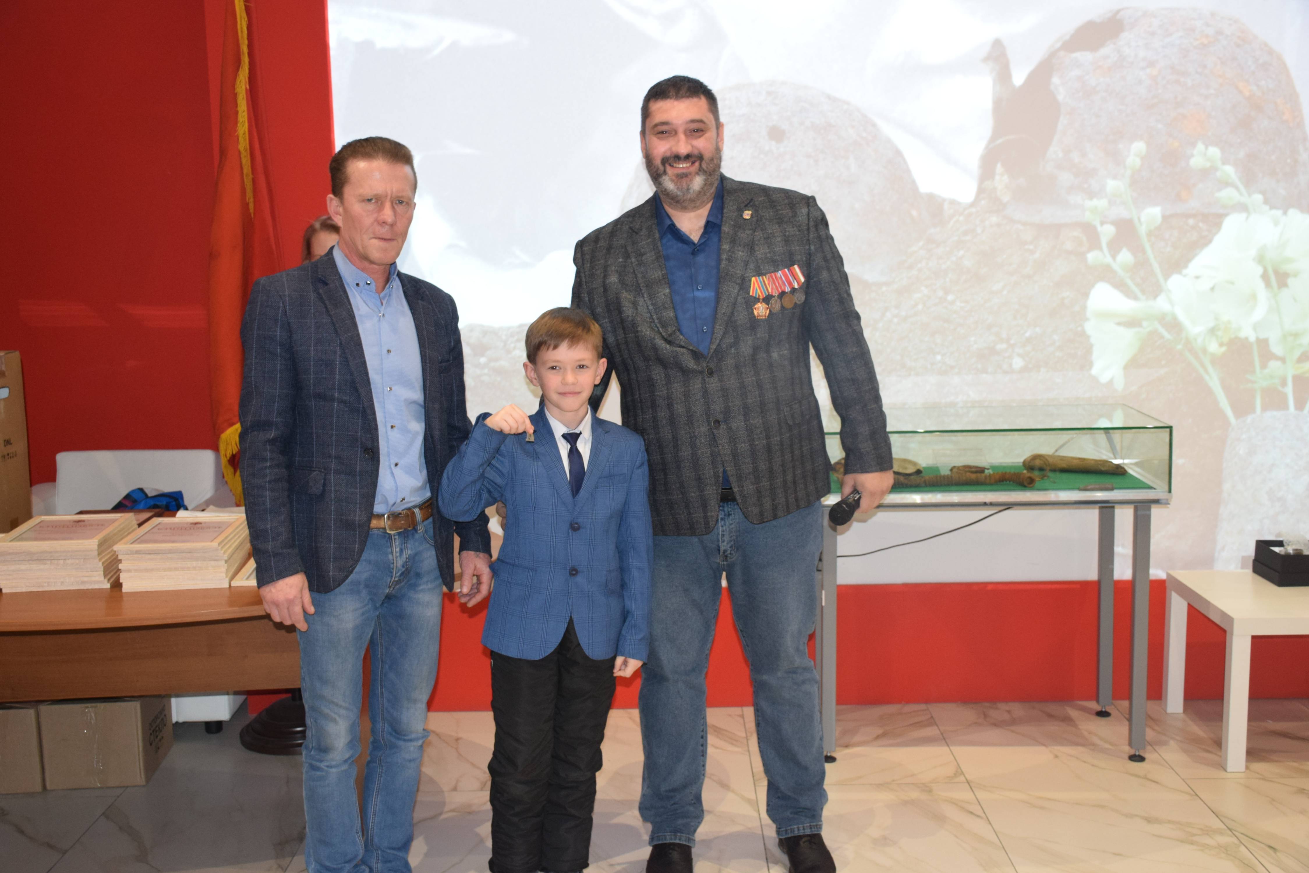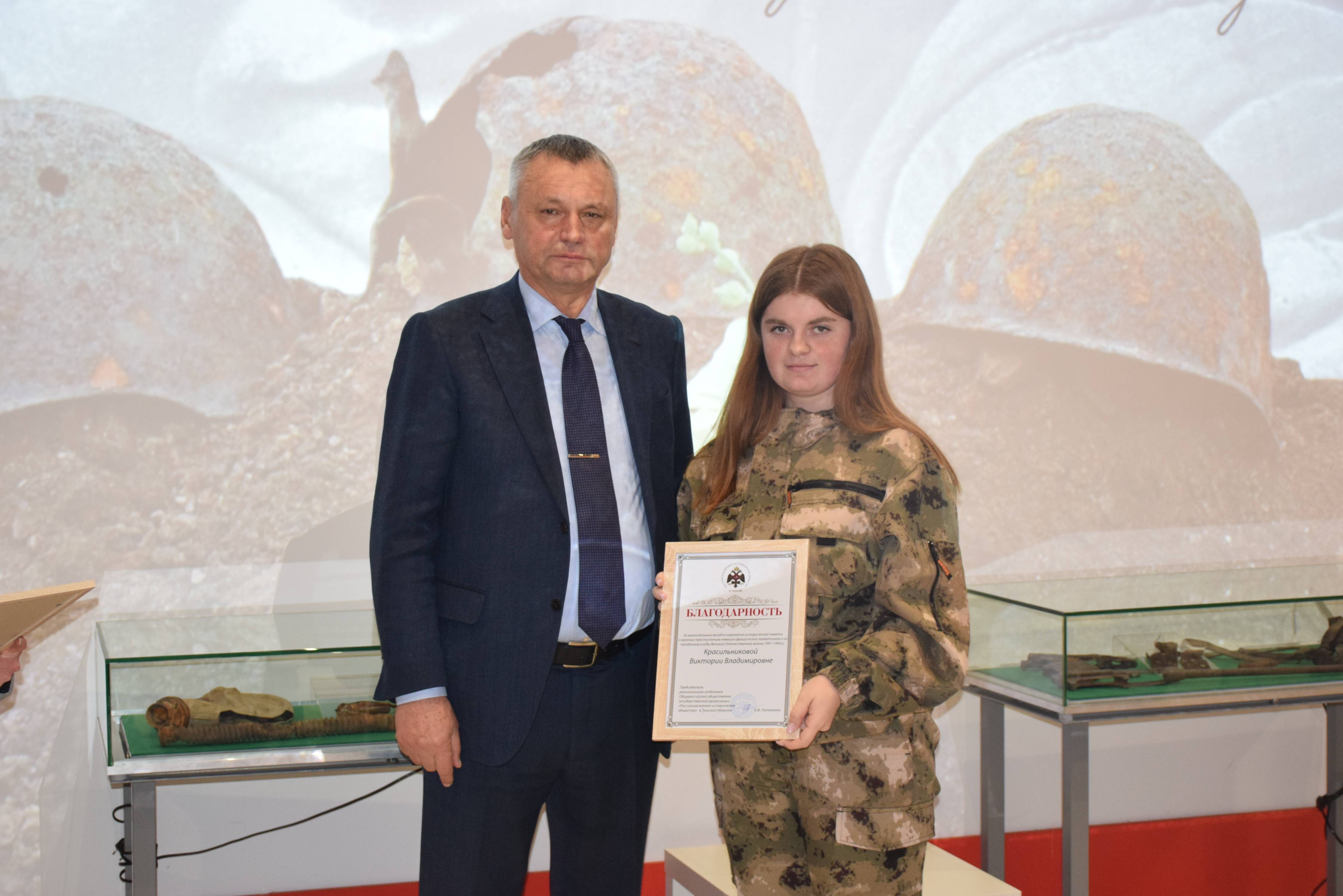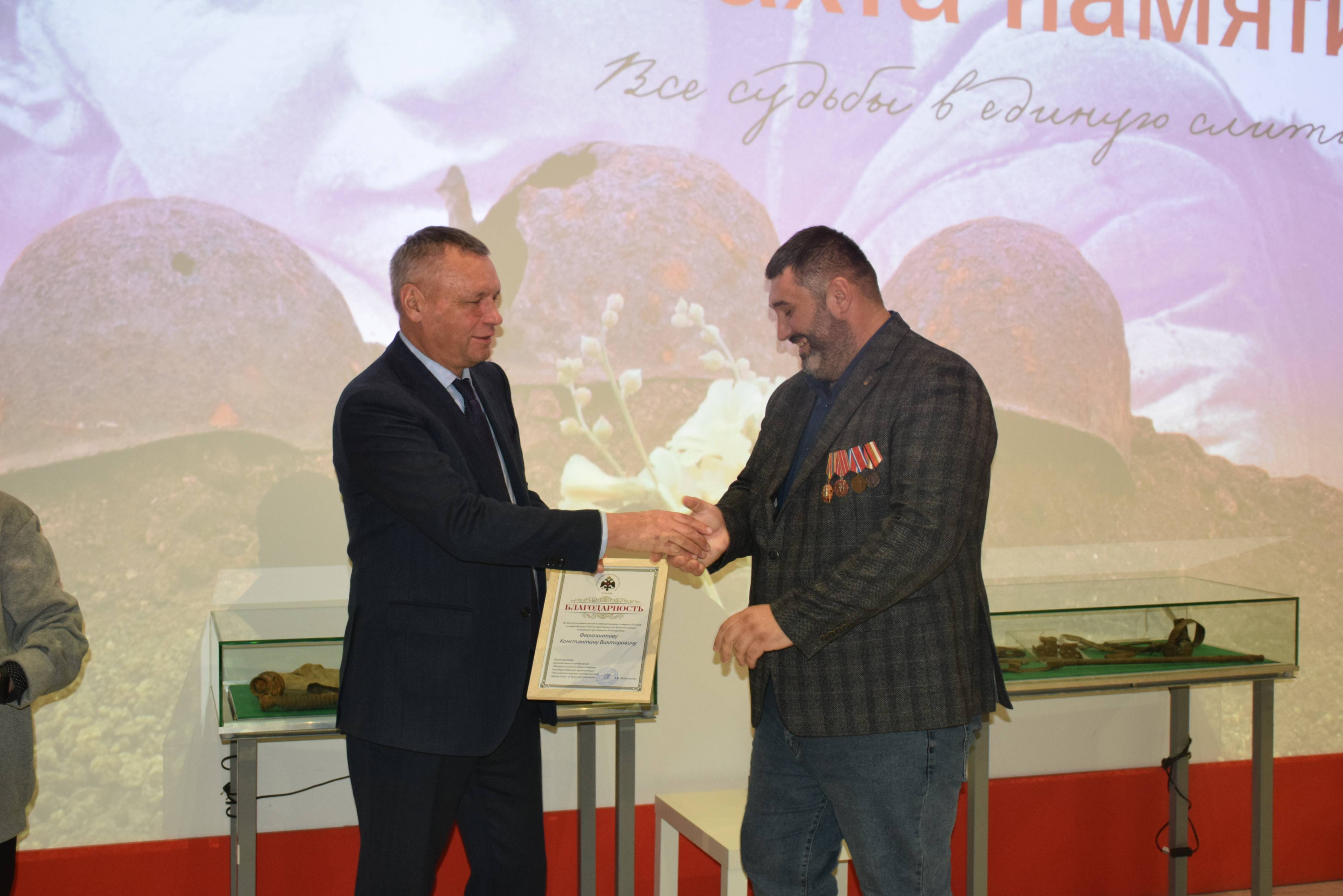 Председатель Тульского регионального отделения РВИО Александр Потапенко и Константин Ферапонтов вручили наиболее отличившимся поисковикам памятные награды, значки и благодарности от Российского военно-исторического общества и Поискового движения России.
