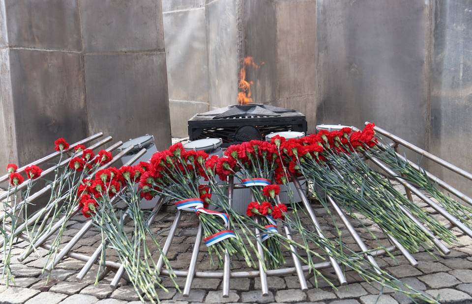 После приветственных слов участники митинга возложили цветы к Вечному огню и почтили память погибших воинов-защитников Отечества минутой молчания. Затем была развернута копия Знамени Победы.