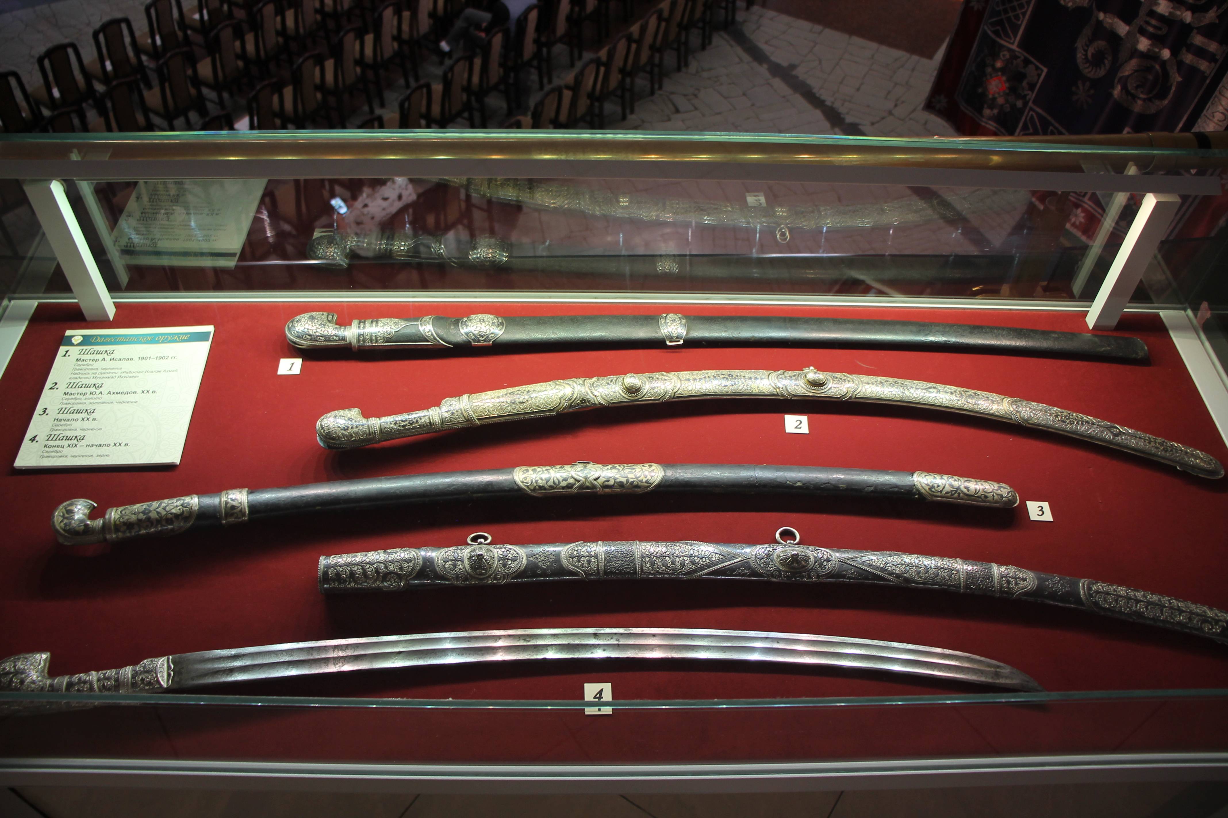 Внимание привлекут именные образцы холодного оружия: кинжал-кама, изготовленный мастером Базалаем в середине ХIХ века для сына Имама Шамиля – Магомеда-Шафи, сабля участника русско-турецкой войны и кавалера Ордена Святого Георгия Исилава Хизроева, кинжал-кама Героя Советского Союза М.Ю. Гамзатова.