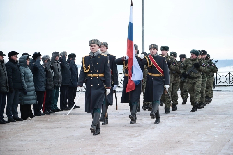 В завершение митинга-реквиема взвод почётного караула военнослужащих Ульяновского территориального гарнизона прошёл торжественным маршем перед Вечным огнём.
