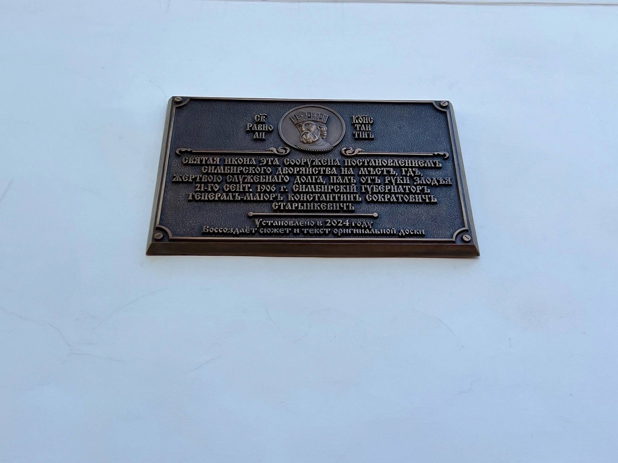 По благословению Митрополита Симбирского и Новоспасского Лонгина руководитель отдела Симбирской епархии по взаимодействию с казачеством иерей Михаил Лазарев совершил панихиду и освятил мемориальную доску, на которой изображен небесный покровитель губернатора — святой равноапостольный царь Константин и воссоздан оригинальный текст иконы, установленной на здании Дворянского собрания сразу после гибели губернатора в 1906 году: «Святая икона эта сооружена постановлением Симбирского дворянства на месте, где жертвою служебного долга пал от руки злодея 21-го сентября 1906 года Симбирский губернатор, генерал-майор Константин Сократович Старынкевич».