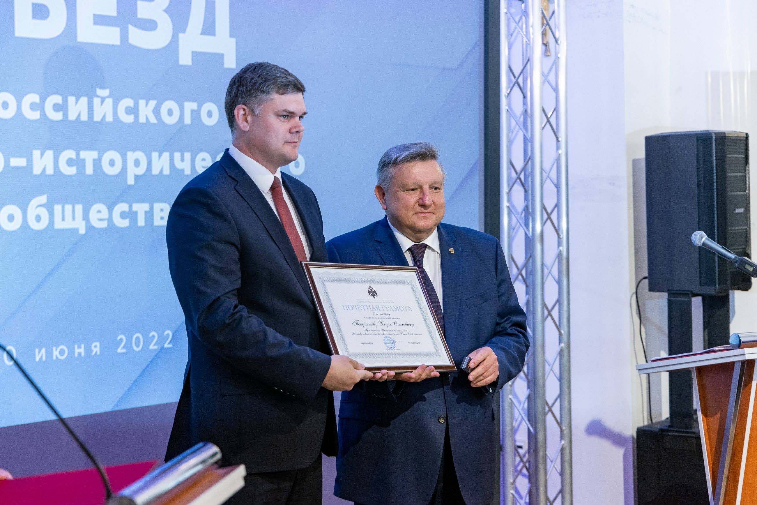 Председатель Российского военно-исторического общества Владимир Мединский вручил председателю регионального отделения РВИО Игорю Петрищеву Почетную грамоту за личный вклад в сохранение исторической памяти.