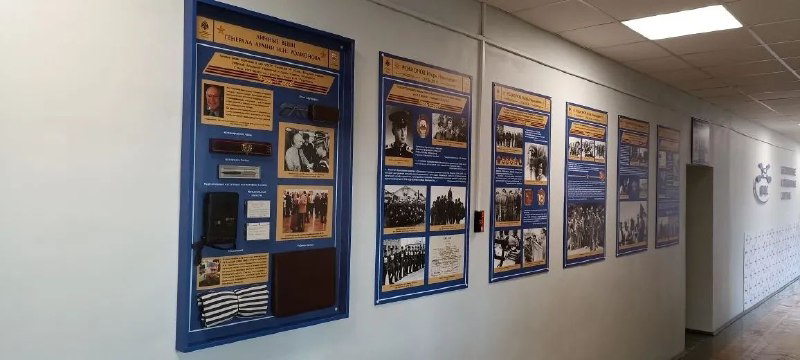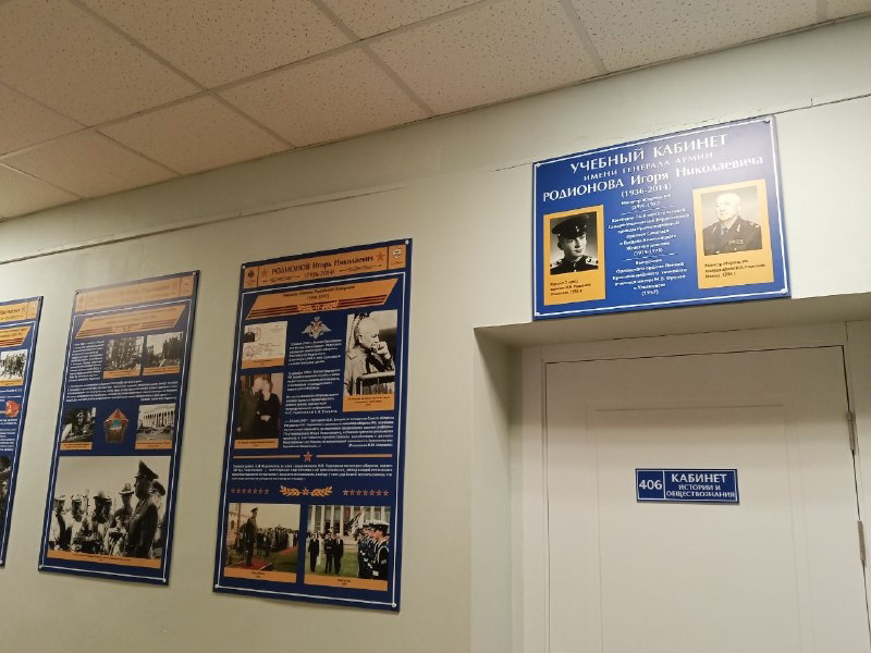 РО РВИО подготовило для размещения в классе стенды с уникальными фотографиями, отражающими служебную карьеру Игоря Родионова. Здесь же расположена стенд-витрина, в которой представлены его личные вещи, переданные сыном генерала.