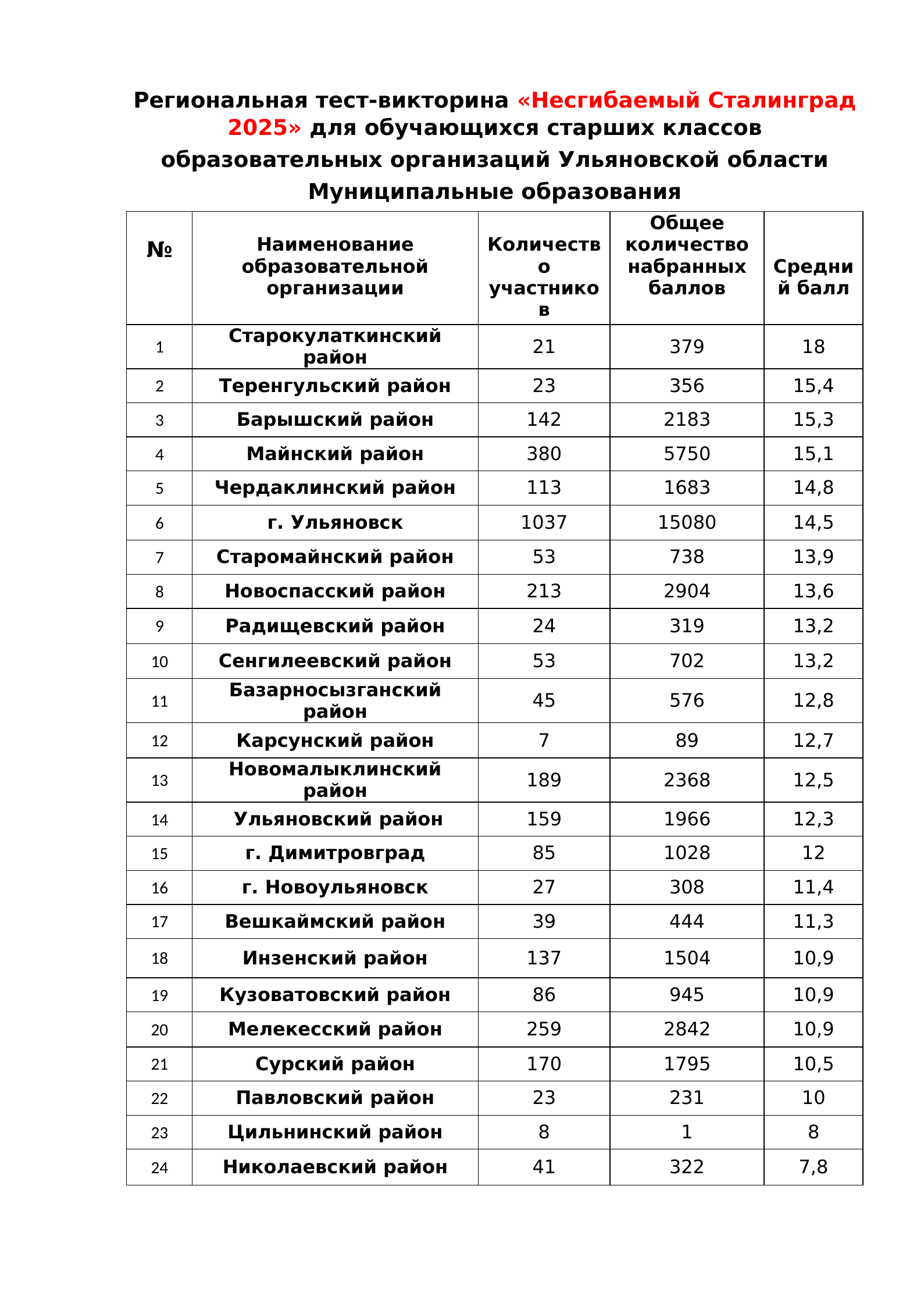 С 3 по 10 февраля была проведена региональная онлайн–викторина «Несгибаемый Сталинград» для обучающихся старших классов образовательных организаций Ульяновской области. Всего в викторине приняли участие 3334 старшеклассников.