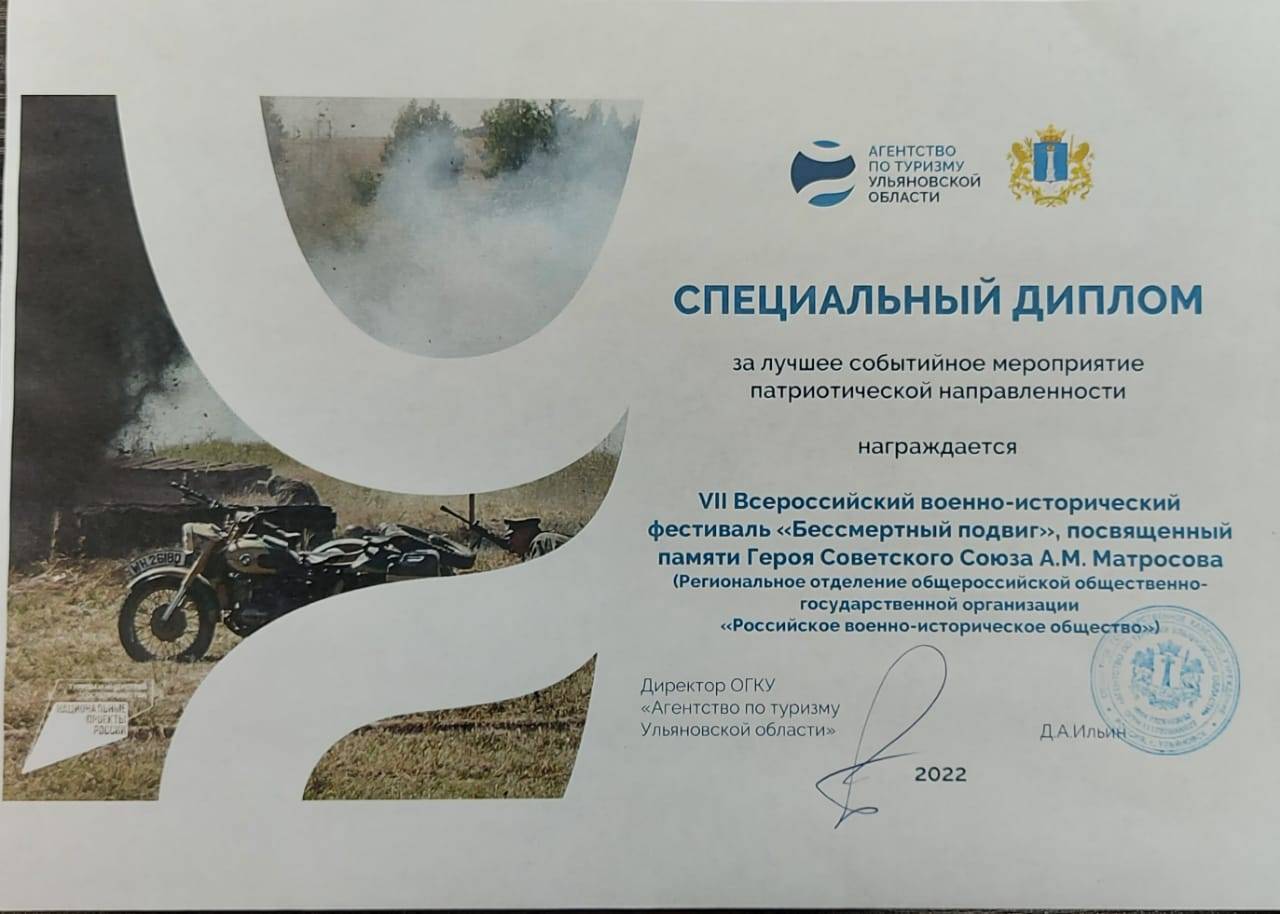Дипломом отмечено проведение VII Всероссийского военно-исторического фестиваля «Бессмертный подвиг», посвященного памяти Героя Советского Союза А.М. Матросова.