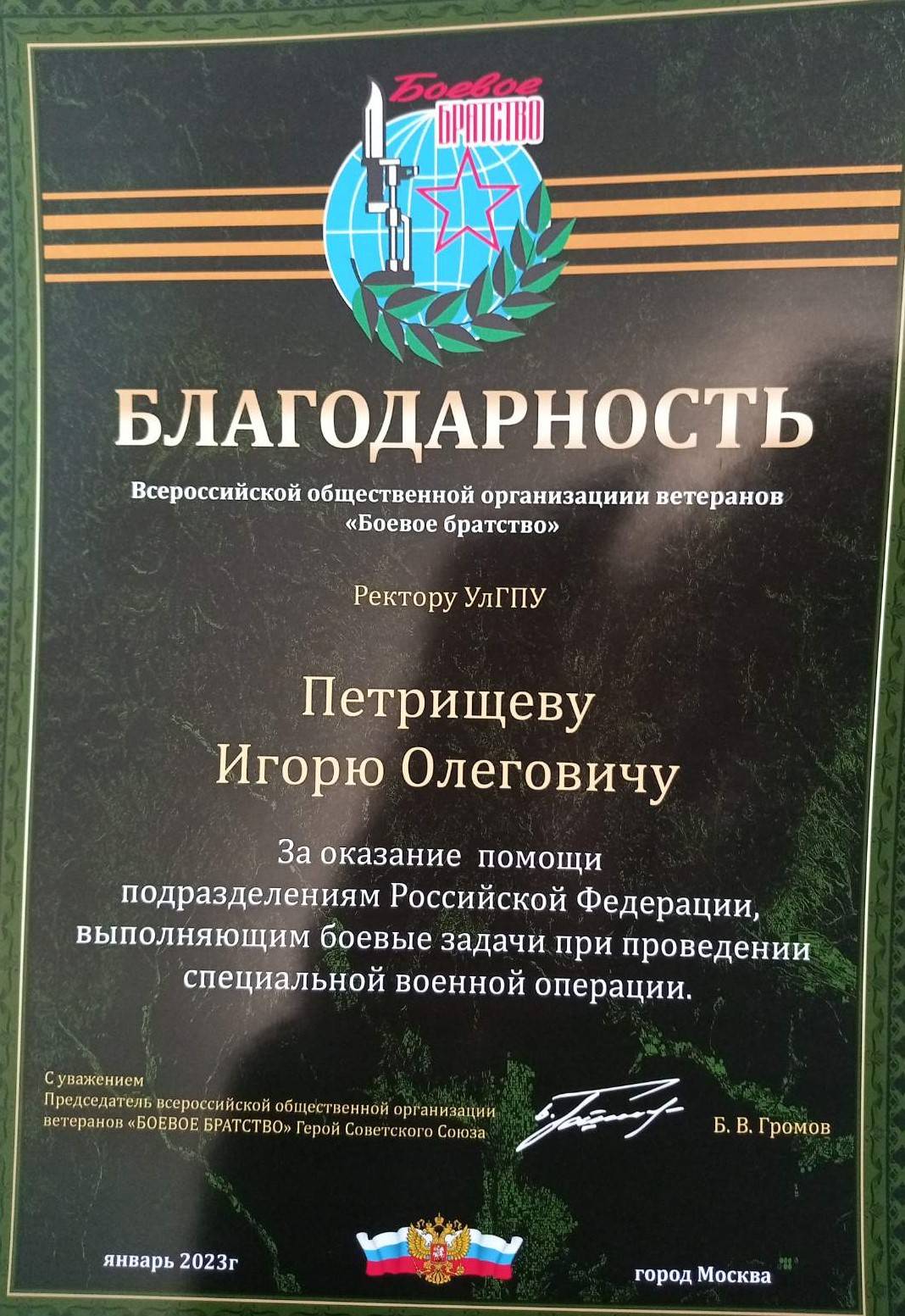 Председатель Всероссийской Общественной организации ветеранов «БОЕВОЕ БРАТСТВО» Герой Советского Союза, командующий генерал Громов Борис Всеволодович благодарит личный состав регионального отделения и лично Председателя УРО РВИО Игоря Олеговича Петрищева за активную совместную работу по оказанию помощи подразделениям Российской Федерации, выполняющим боевые задачи при проведении специальной военной операции.
