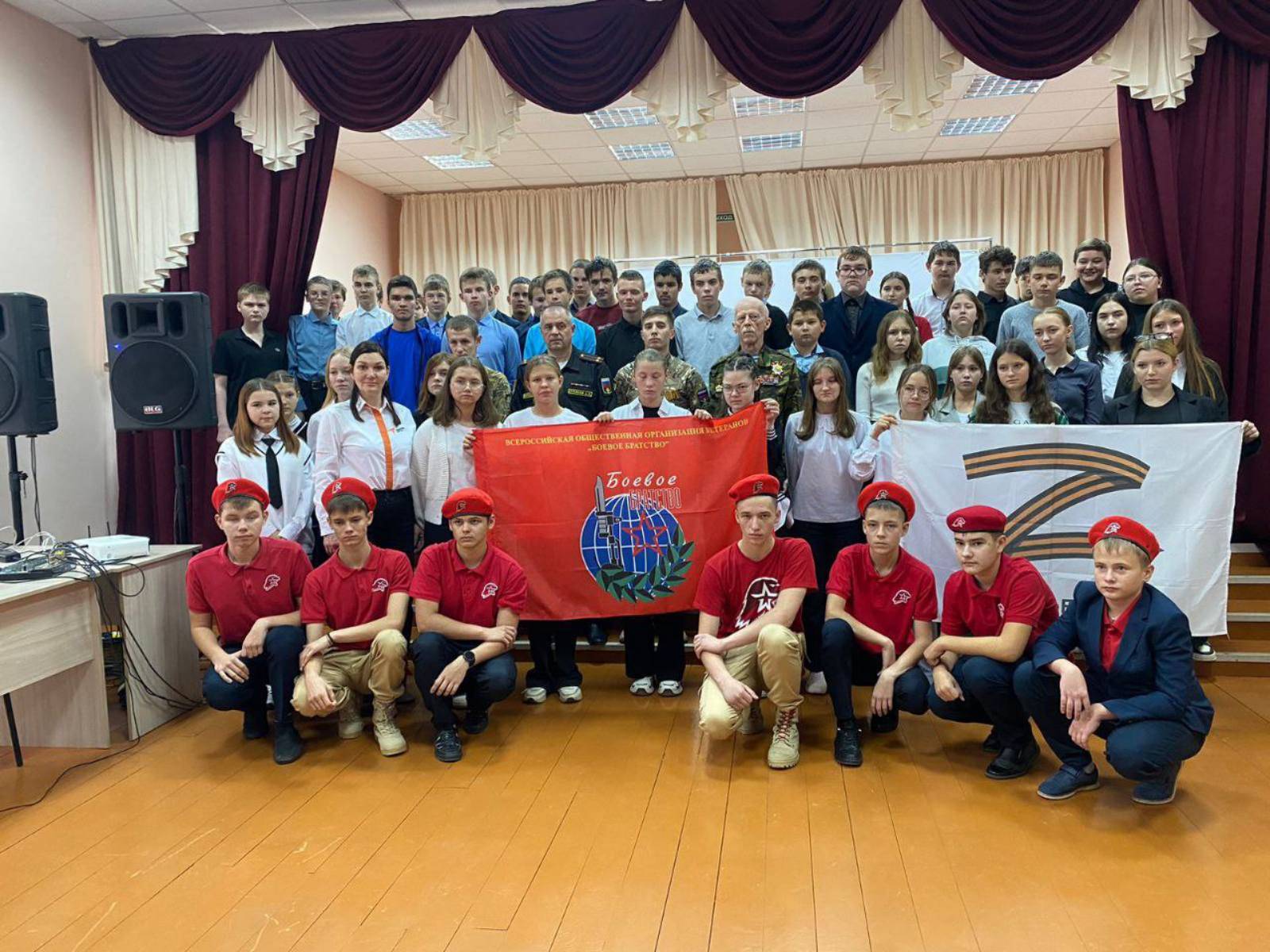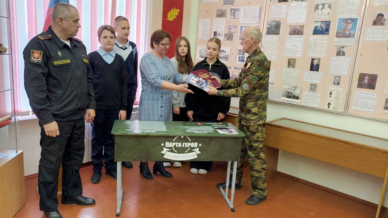 Школьному музею были подарены книги: "Солдаты отчизны" и "О жизненном пути и служебной деятельности кавалера двух орденов Мужества гвардии полковника Кузьминова С. И."- погибшего в ходе проведения СВО. На занятии присутствовали 56 учеников, зам. директора по воспитательной работе, два преподавателя и два участника СВО, прибывшие в отпуск.