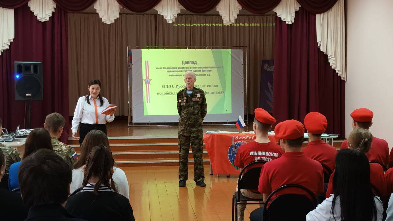 24 октября членом ульяновского отделения Всероссийской общественной организации ветеранов "Боевое братство" полковником в отставке Михайловым В. В. проведен урок- мужества для школьников 9А и 10А классов СОШ г. Барыш. В ходе занятия рассмотрены вопросы зарождения и развития украинского национализма, зверства бандеровцев в годы Великой Отечественной войны. Доведены цели и задачи СВО. Рассмотрены подвиги земляков героев Советского Союза младшего лейтенанта Акимова В. А. и младшего лейтенанта Беркутова И. Б.