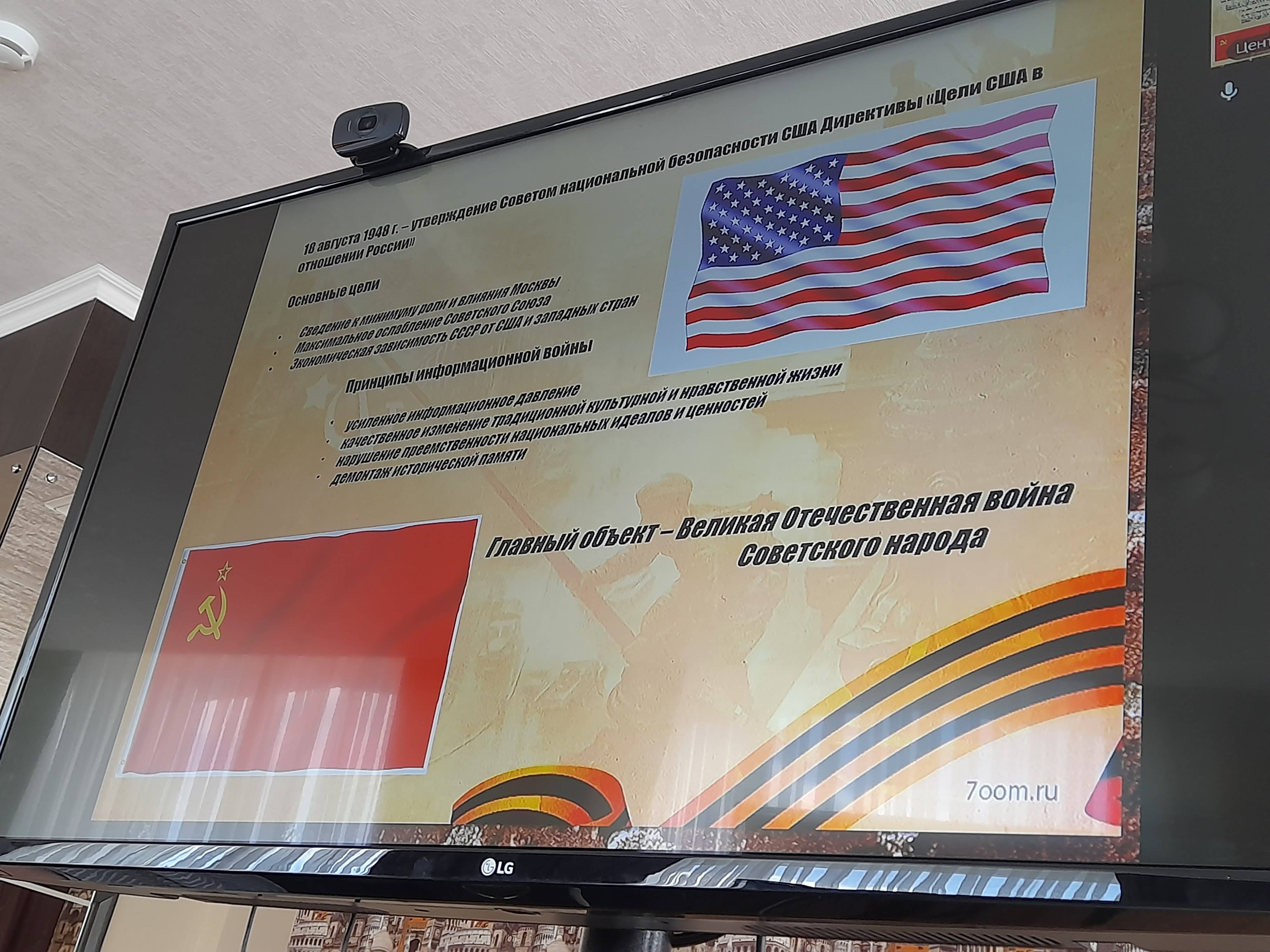 Бравина Марина Алексеевна, член Регионального отделения Российского военно-исторического общества в Ульяновской области, к.и.н., доцент, зав. кафедрой методики гуманитарного и поликультурного образования ФГБОУ ВО «Ульяновский государственный педагогический университет имени И.Н. Ульянова» выступила с темой: «Великая Отечественная война как объект информационных войн». Тема, поднятая Мариной Бравиной, не является новой, но обрела особую популярность в современных условиях. Ещё в 1948 году Советом национальной безопасности США была принята Директива «Цели США в отношении России».