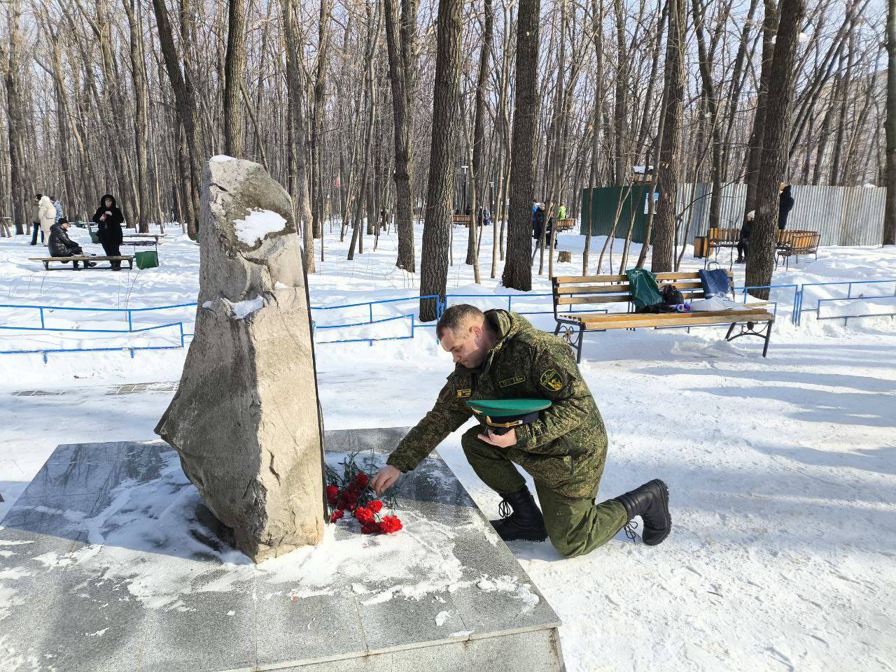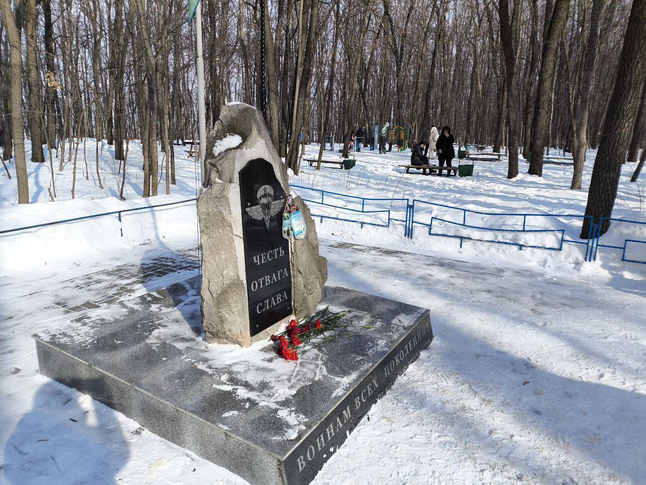 Так же сегодня воины пограничники возложили цветы у памятника десантникам в честь погибших Псковских десантников 6 роты.