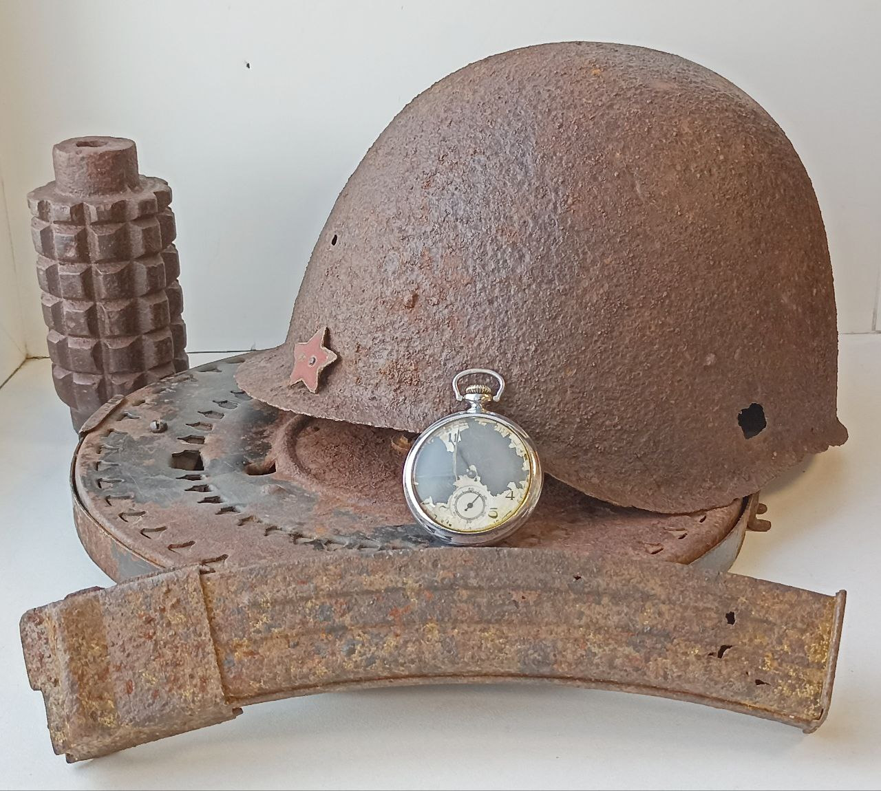 Рассказ лектора был подкреплён показом уникальных экспонатов из Музея боевой славы Железной Дивизии. Эти предметы, собранные поисковиками на местах кровопролитных боев у Синявинских высот, стали немыми свидетелями стойкости и героизма. Среди них – каска СШ-40, диск от пулемета Дегтярева, рожковый магазин от пистолета пулемета Шпагина, портсигар с изображением «Медного всадника», карманные часы бойца РККА, винтовочные и пулеметные гильзы, произведённые на Ульяновском патронном заводе им. Володарского в 1941–1944 годах, и, конечно же, медаль «За оборону Ленинграда». Каждый экспонат – частица истории, хранящая память о тех, кто сражался за свободу советского народа.