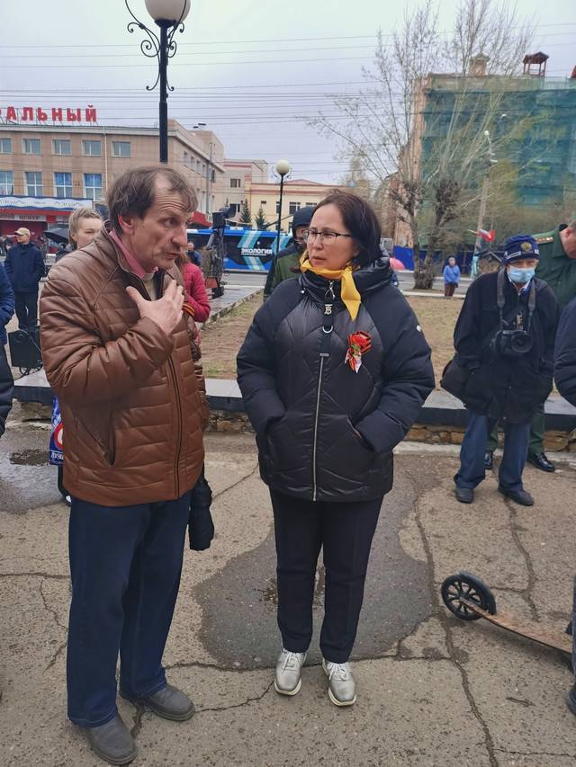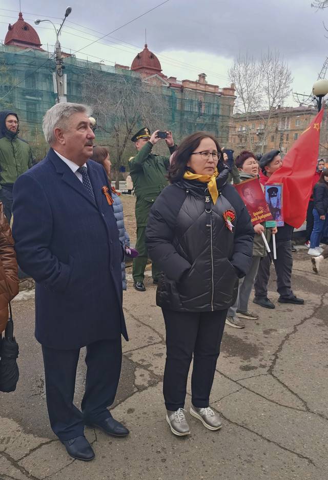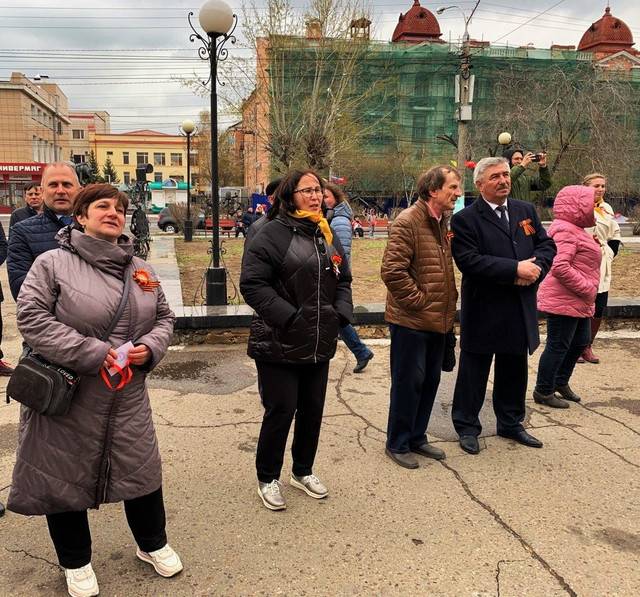 После музыкальной композиции, исполненной Ансамблем песни и пляски Восточного военного округа (художественный руководитель О.С. Евлахин) на площадке кинотеатра «Удокан» с приветственной речью выступил профессор, доктор исторических наук – В.И. Мерцалов. Он сказал следующее: «Дорогие друзья! Еще раз всех с нашим замечательным праздником, с Днем Победы, Великой Победы! Мы сегодня снова вспоминаем и фронт, и тыл, мощное единство, которое обеспечило эту Победу. Память о ней – это фундамент нашей сегодняшней уверенности в отстаивании независимости и мощи России. Америке нужно доминирование над миром, а нам нужна процветающая Россия! За Россию! За Победу! За Президента!»