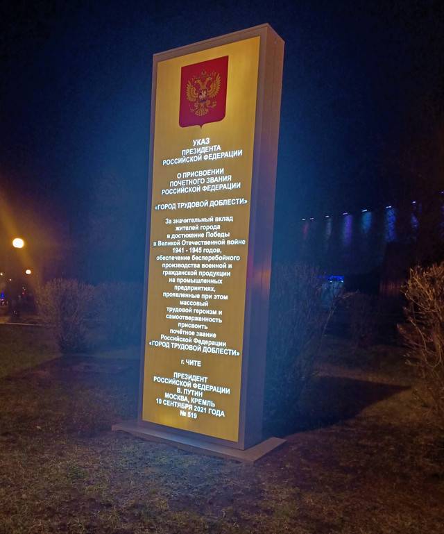 Почетное звание «Город трудовой доблести» было присвоено Чите Указом Президента Российской Федерации В.В. Путина от 10 сентября 2021 года № 519.