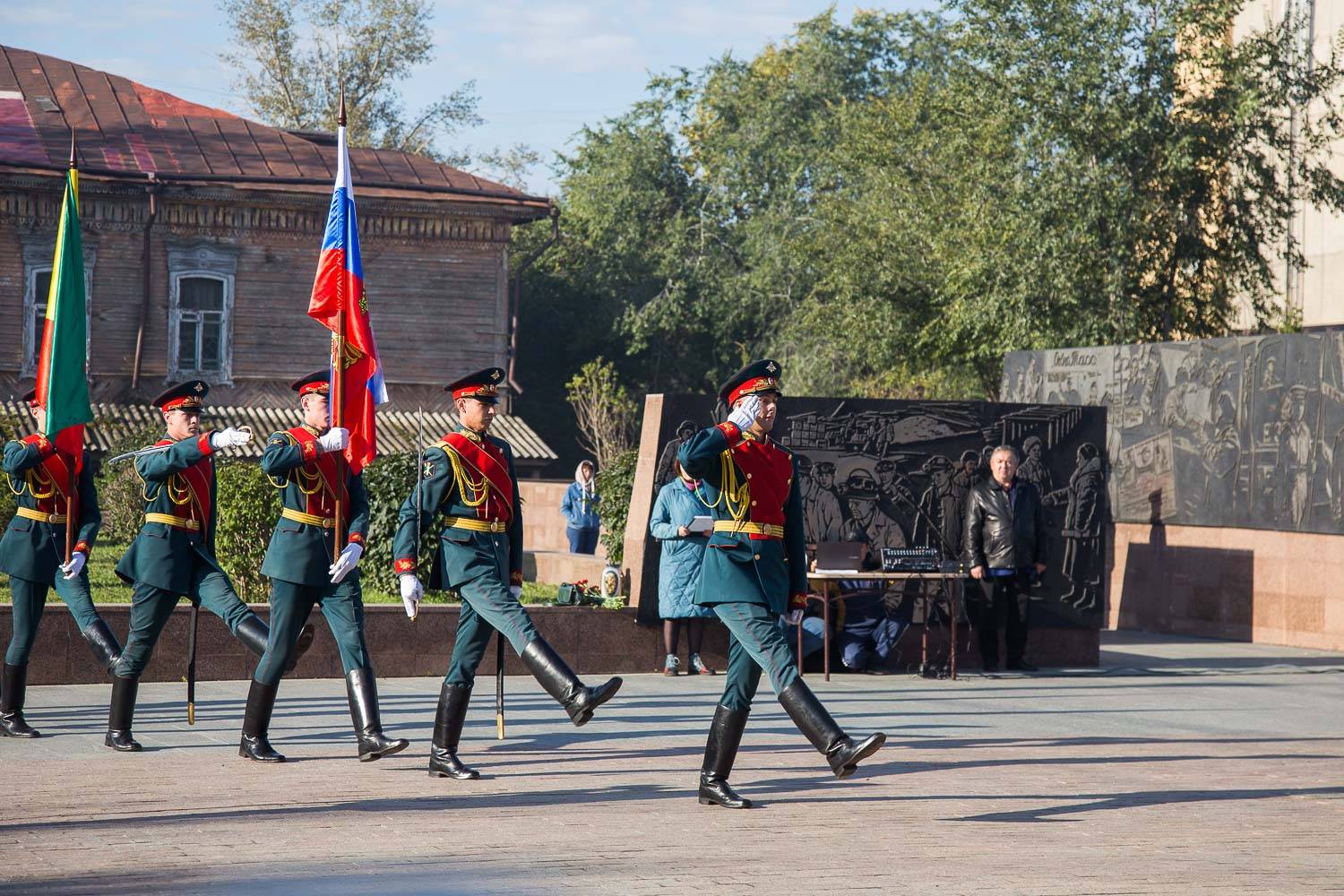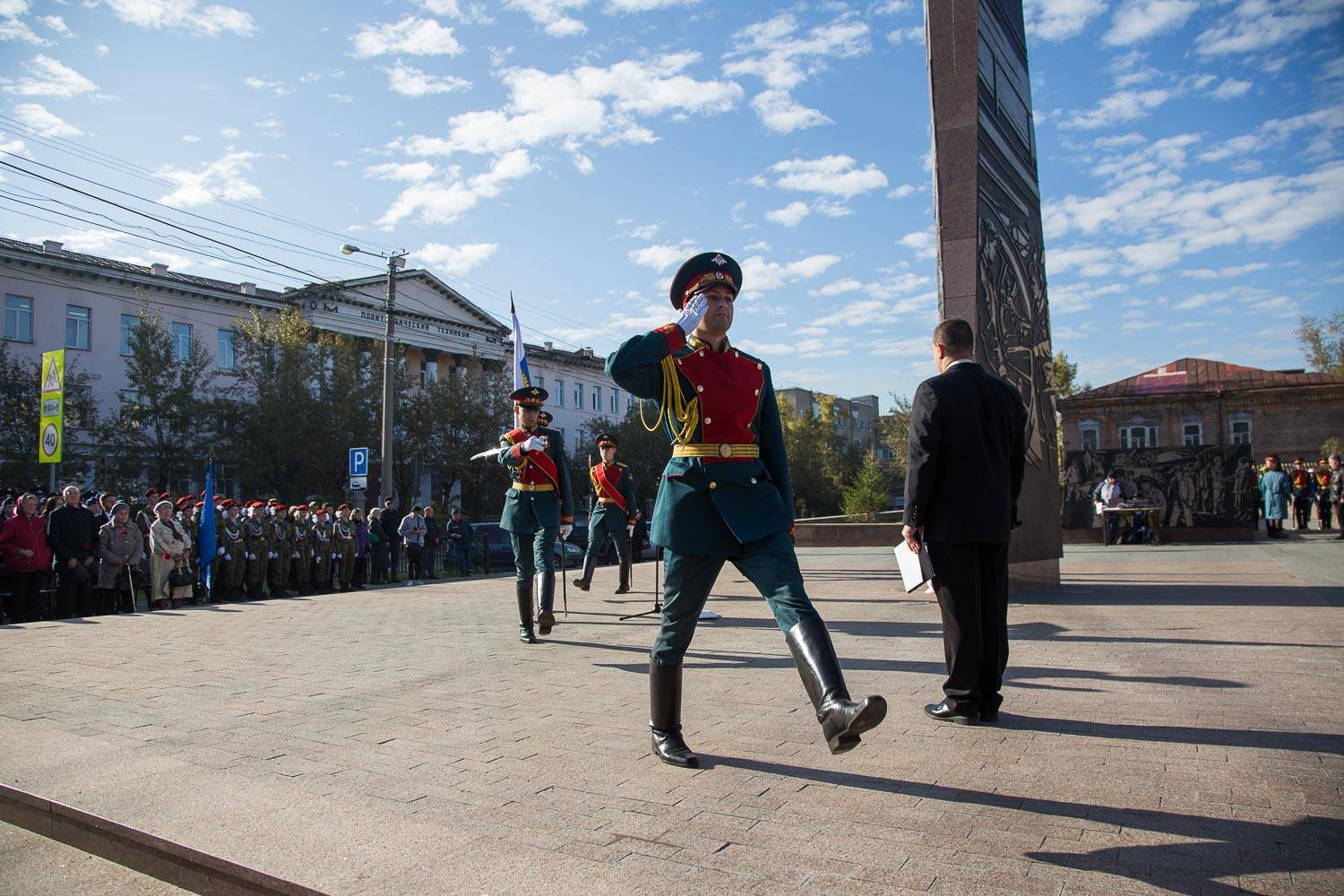 К жителям города также обратился заместитель директора Департамента науки и образования Исполнительной дирекции Российского военно-исторического общества Денис Шполянский: «Прежде всего хочу поприветствовать уважаемых ветеранов и юнармейцев, школьников, которые присутствуют в этом памятном месте в вашем солнечном и гостеприимном городе в преддверии открытия Международного исторического форума. Вчера на пресс-конференции я услышал от уважаемых организаторов мысль о том, что присвоение Чите почетного звания «Город – трудовой доблести» – это лишь первый шаг, и будет продолжена работа историками и руководителями города для того, чтобы присвоить Чите еще и звание «Город воинской славы».