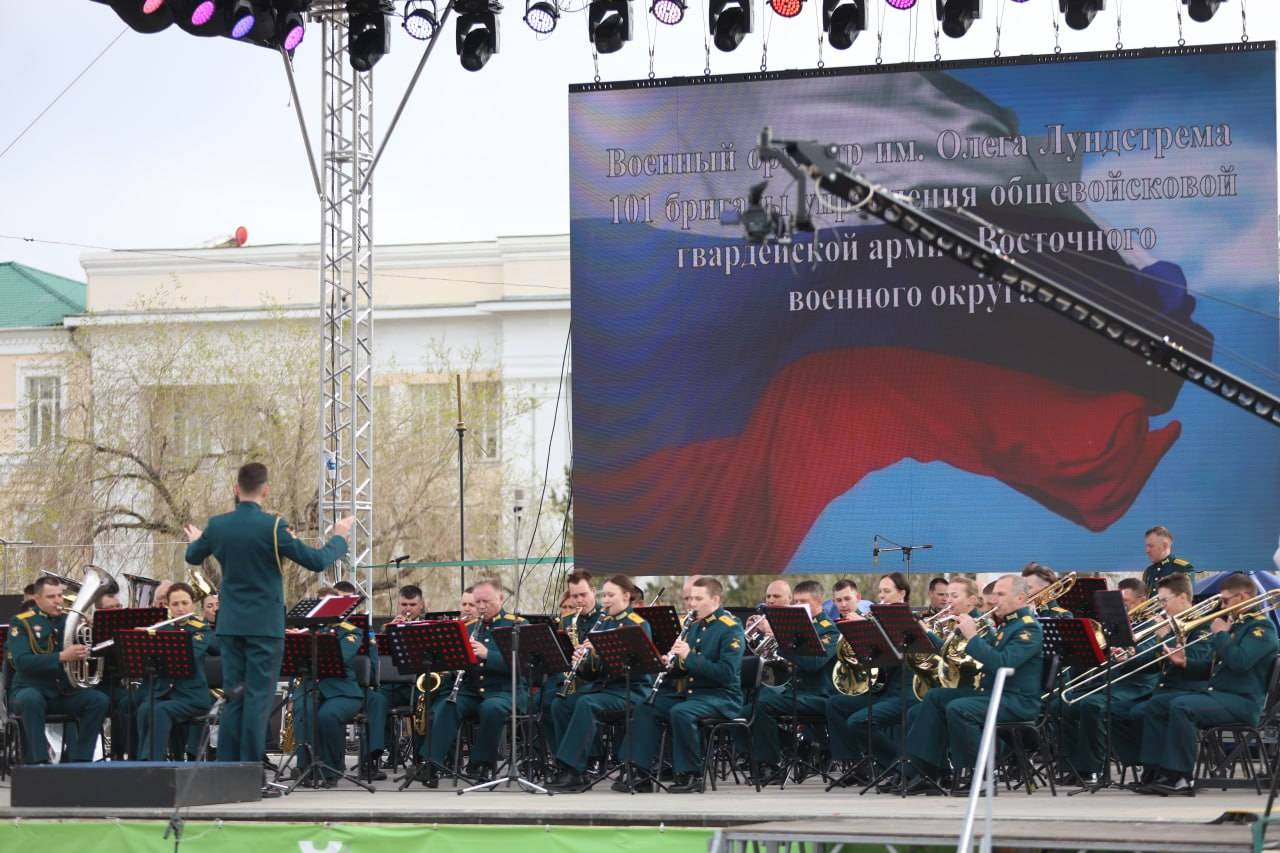 На площади Ленина в Чите прошел фестиваль военных и духовых оркестров «Даурские марши». В концерте приняли участие военные оркестры из Хабаровска и Забайкалья, а также духовые коллективы из Читы и Петровска-Забайкальского.