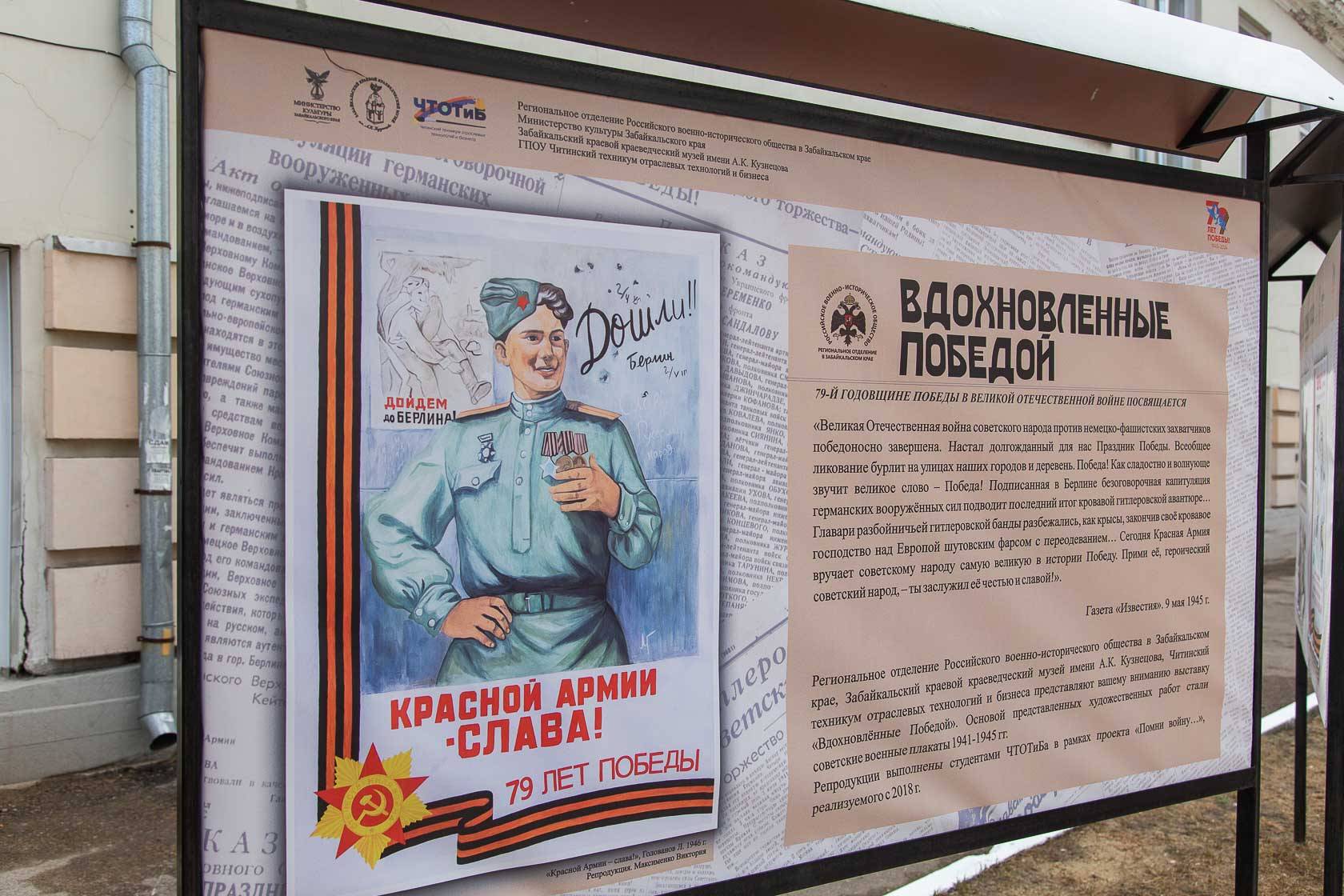 3 мая 2024 года в Забайкальском краевом краеведческом музее имени А.К. Кузнецова прошло открытие выставки "Вдохновленные Победой". На выставке были представлены репродукции плакатов военного времени. Агитационно-патриотические плакаты вошли в историю как «Окна ТАСС», они являлись важным орудием идеологической борьбы, побуждая советский народ к совершению беспримерных боевых и трудовых подвигов. «Окна ТАСС» ярко иллюстрируют жизнь людей в годы войны, а также отражают особенности военно-дипломатических отношений на международной арене в 1941–1945 гг. Представленные репродукции были выполнены студентами, обучающимися по специальности «Архитектура» в Читинском техникуме отраслевых технологий и бизнеса (ЧТОТИБ) . Работы созданы в рамках проекта «Помни войну...», реализуемого на базе ЧТОТИБа с 2018 г.