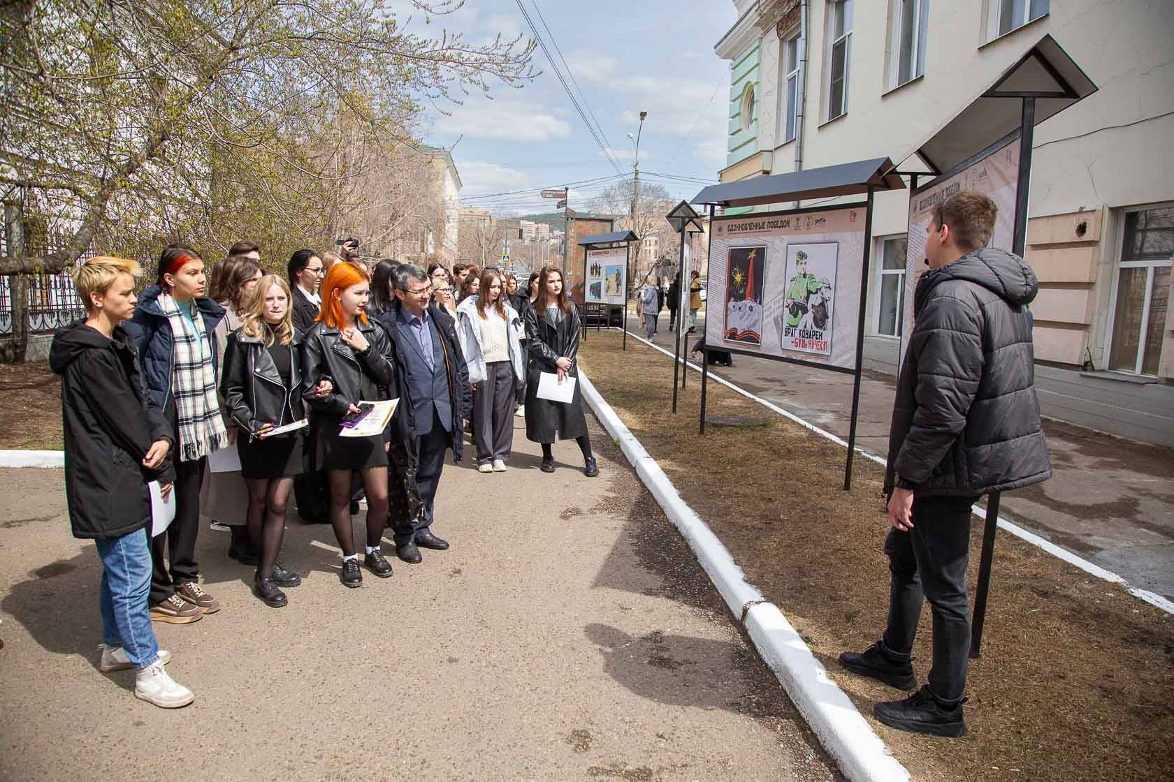 По итогам открытия выставки для студентов провели экскурсию, в ходе которой сотрудник музея рассказал об истории советских агитационных плакатов времен Великой Отечественной войны, отдельных этапах войны и ее итогах, которые ярко отражены в "Окнах ТАСС".