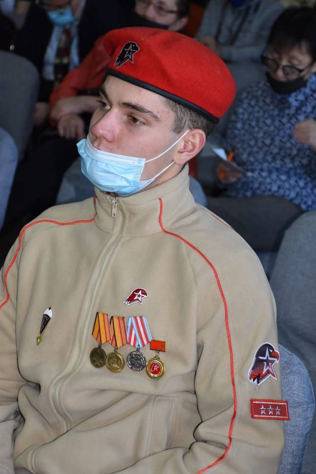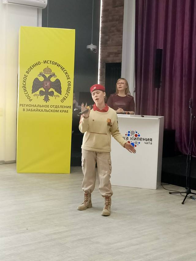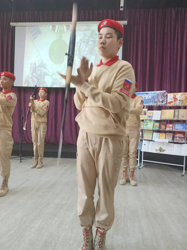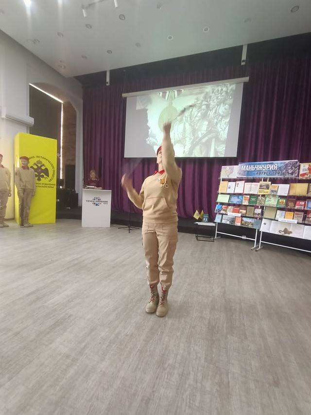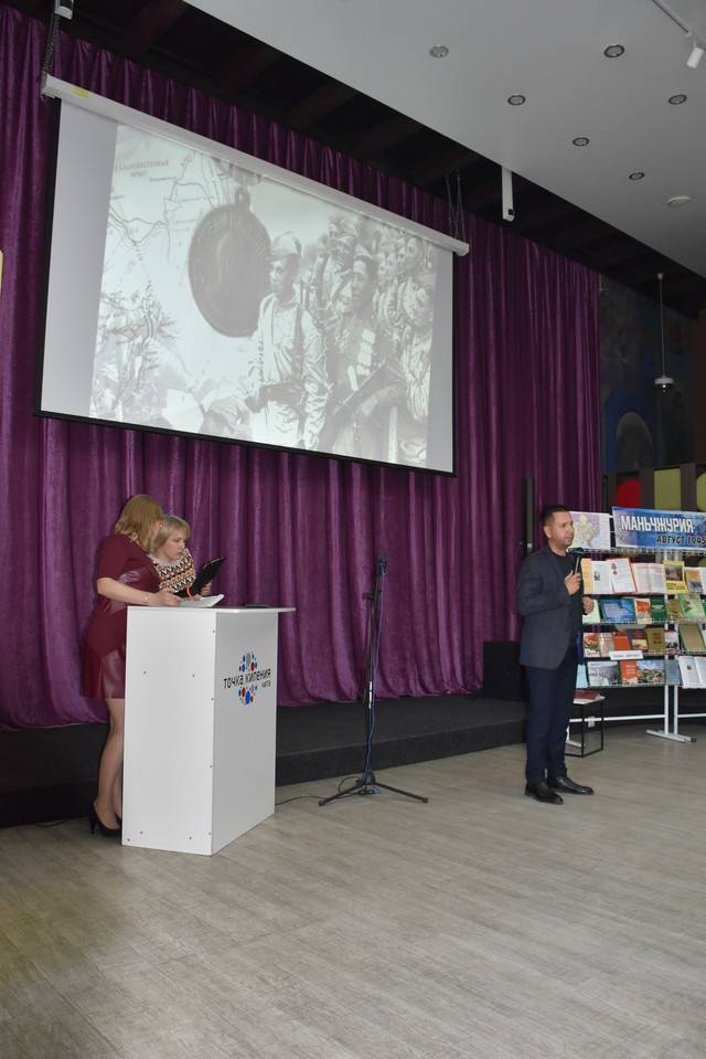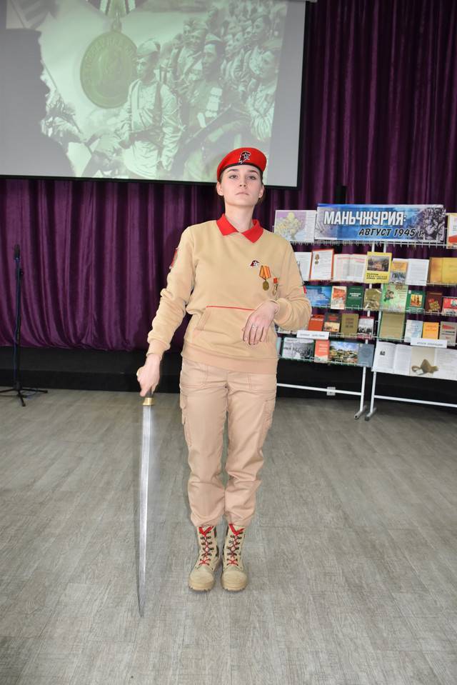 Юнармеец Татьяна Васильева проникновенно исполнила произведения Юлии Паршуты «Месяц май» и Виктора Цоя – «Кукушка». Вниманию собравшейся публике была представлена тематическая выставка «Маньчжурия. 1945 год».