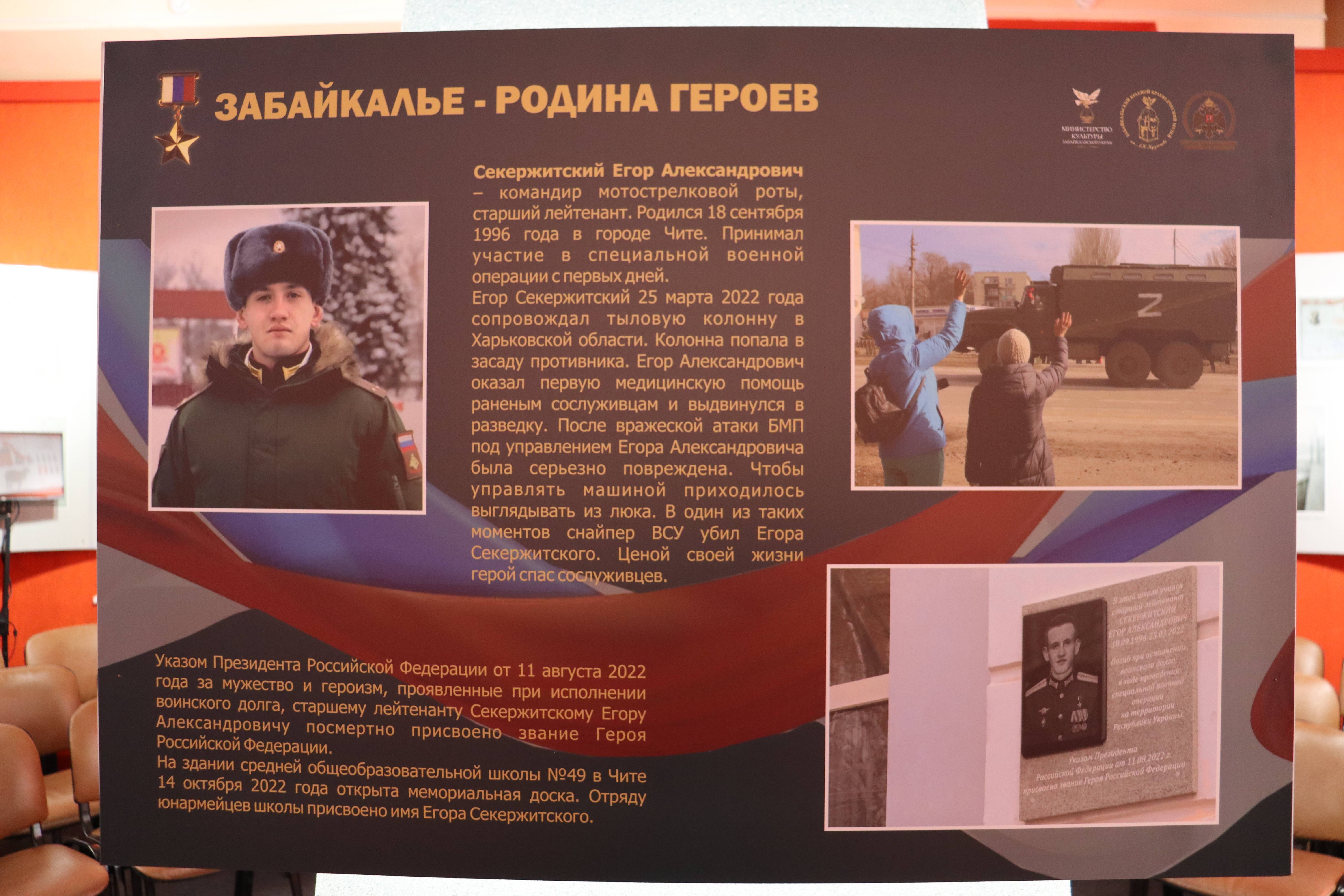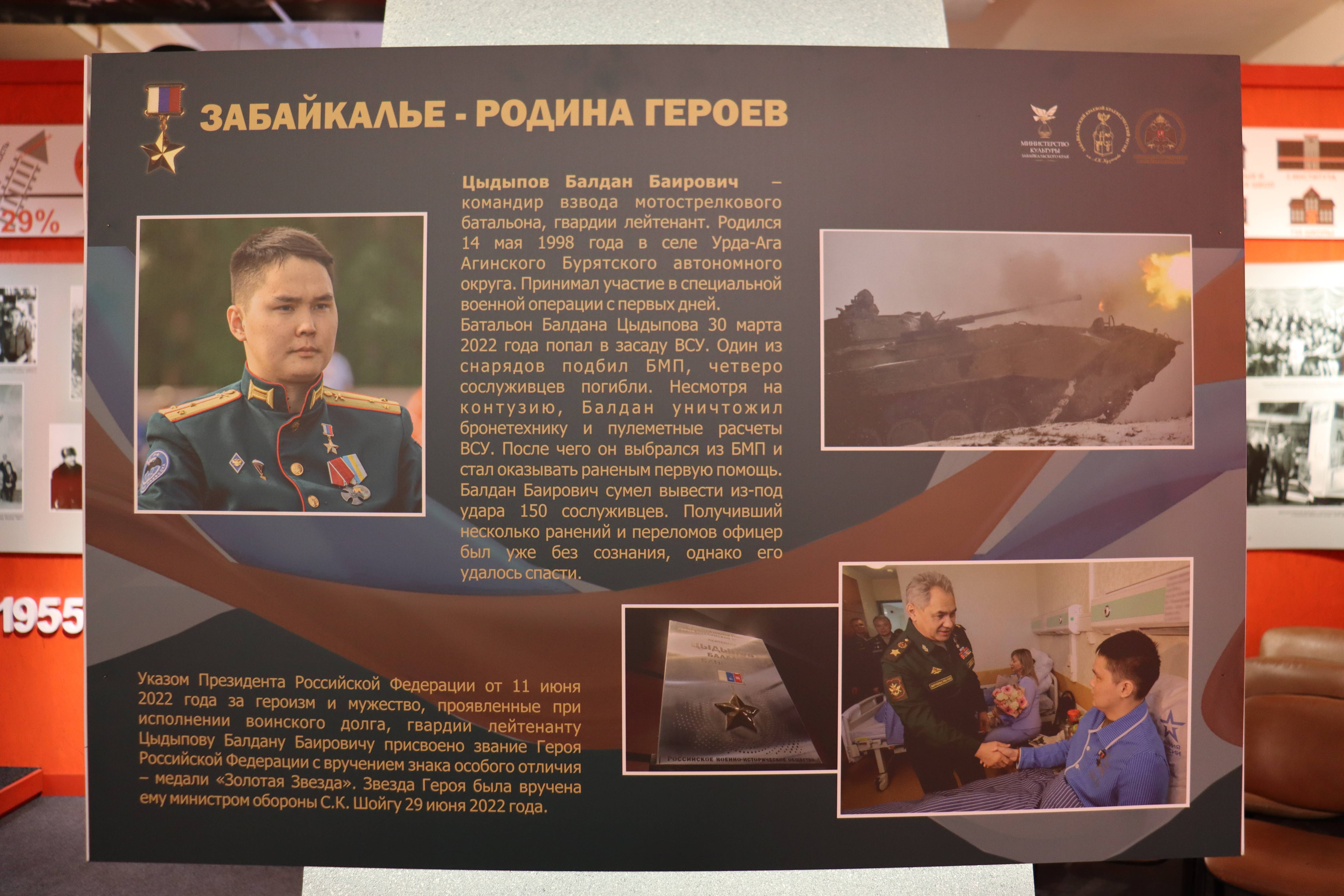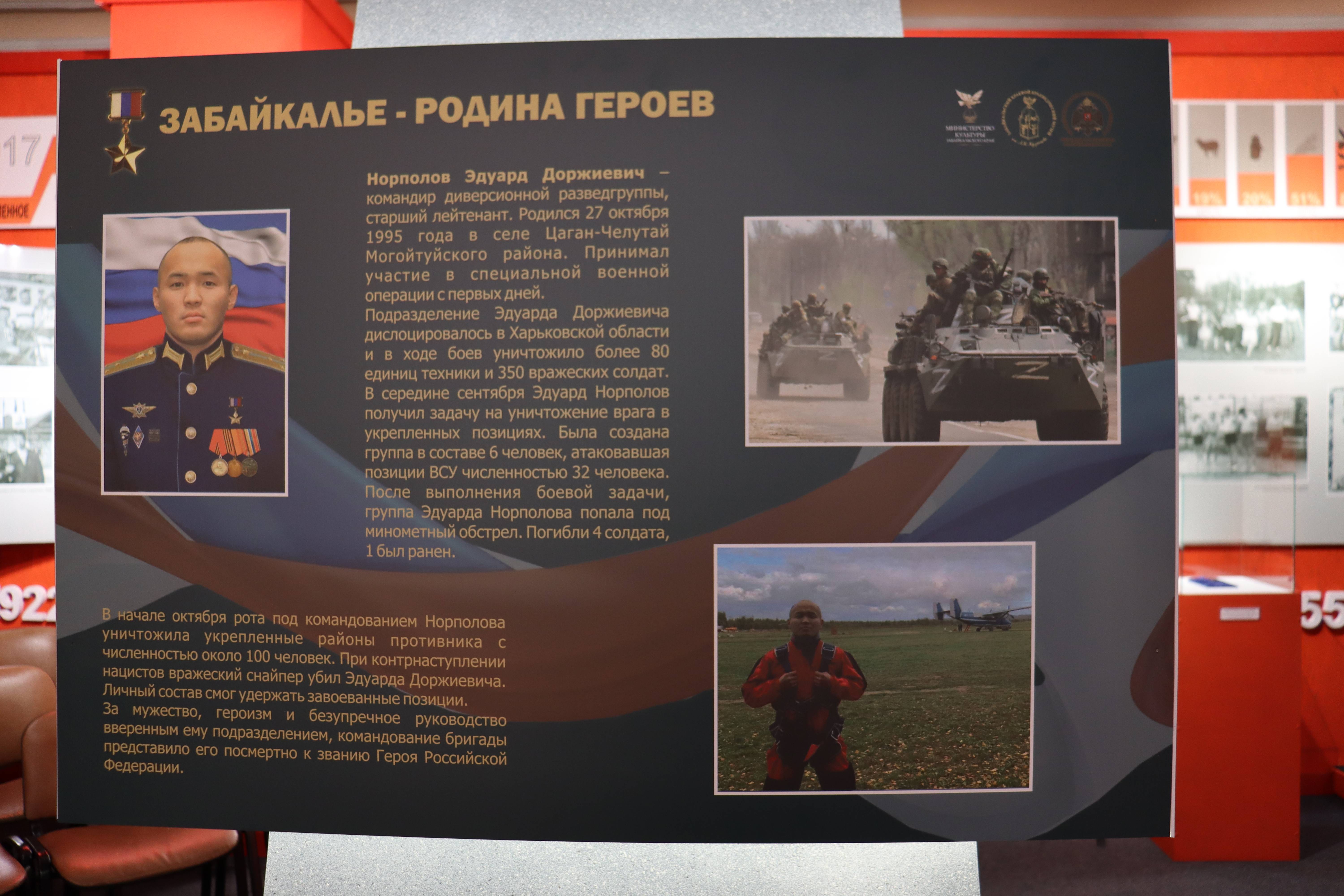 Сегодня, 14 февраля, региональное отделение РВИО в Забайкальском крае совместно с краеведческим музеем провело урок мужества на тему: «Забайкалье – Родина Героев», который был посвящен героям-забайкальцам – участникам специальной военной операции. На импровизированном монументе были размещены информационные стенды с биографическими справками Героев Российской Федерации – Алексея Бернгарда, Балдана Цыдыпова, Егора Секержитского и Эдуарда Норполова.
