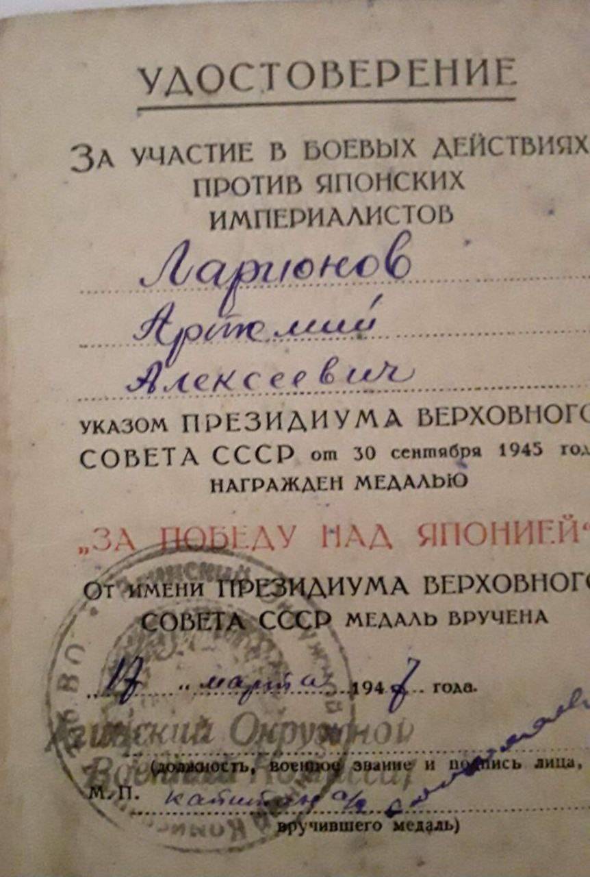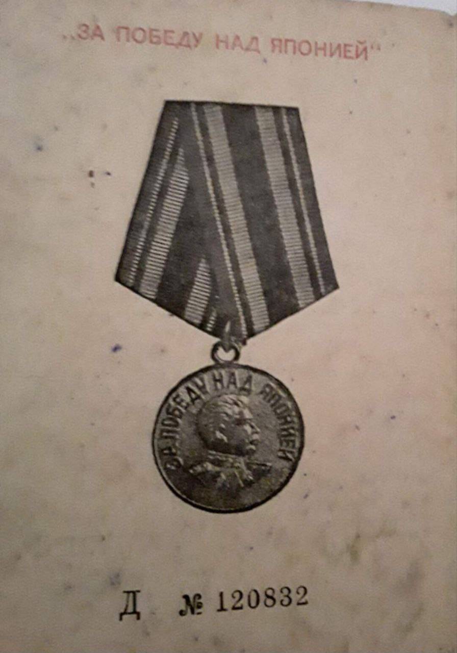 С большим сожалением Валентина Прокопьевна рассказала, что медаль «За победу над Японией» утеряна, хотя удостоверение к медали сохранилось. Это очень ценная реликвия для семьи.