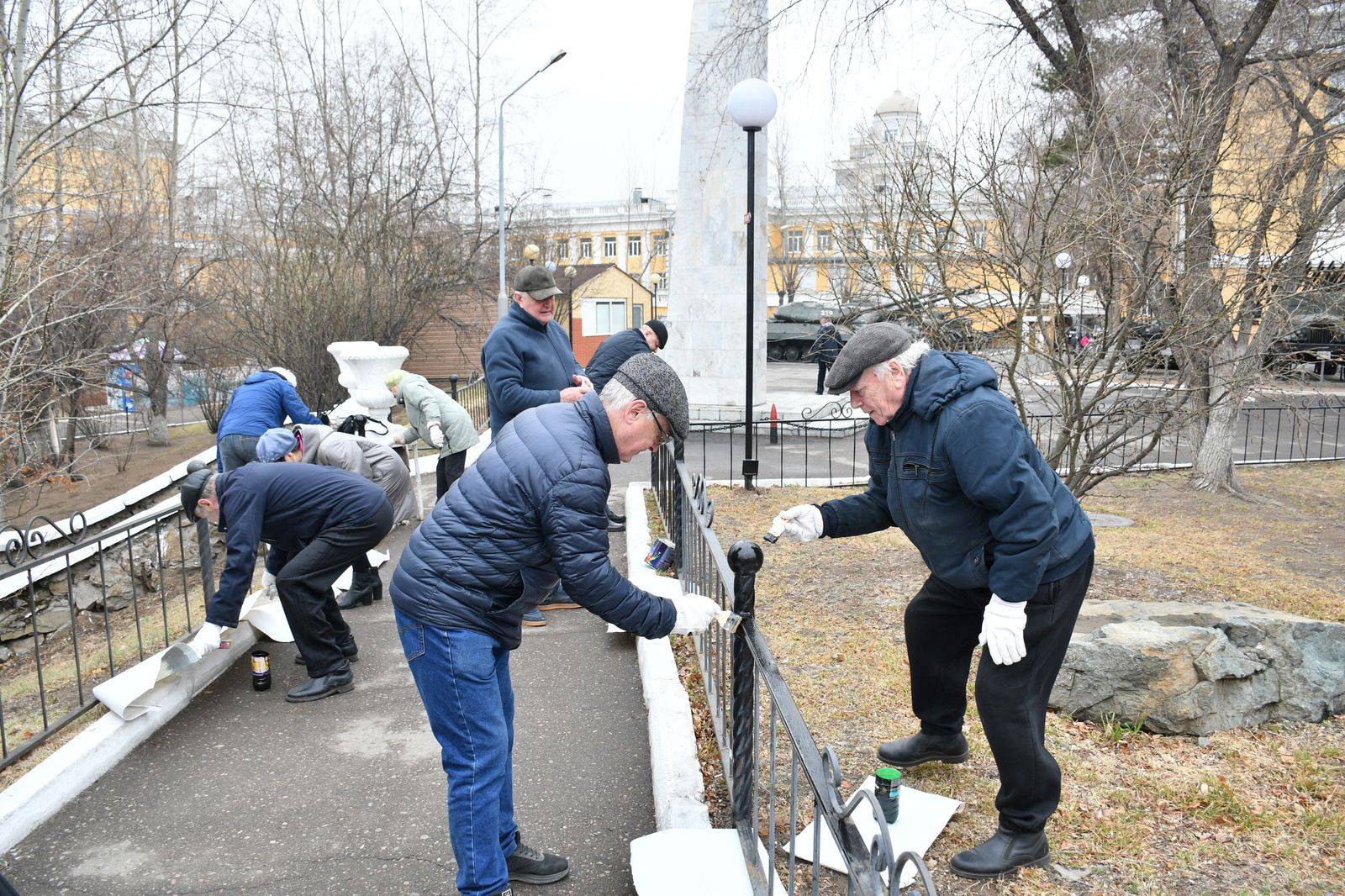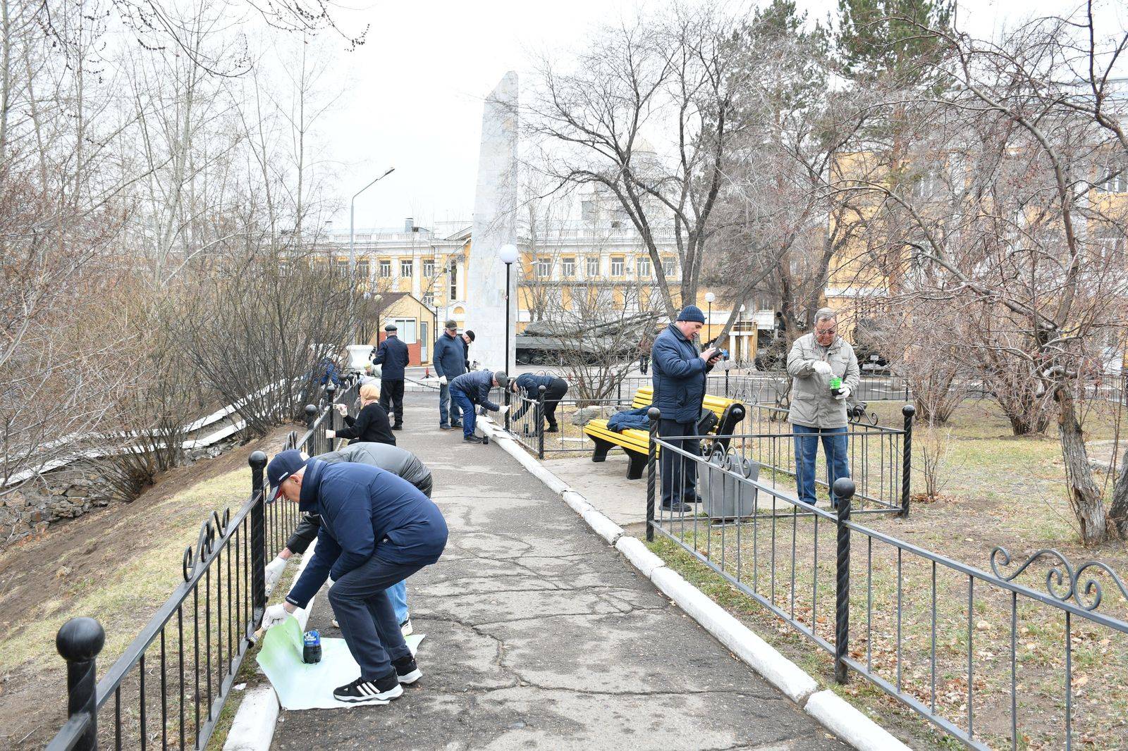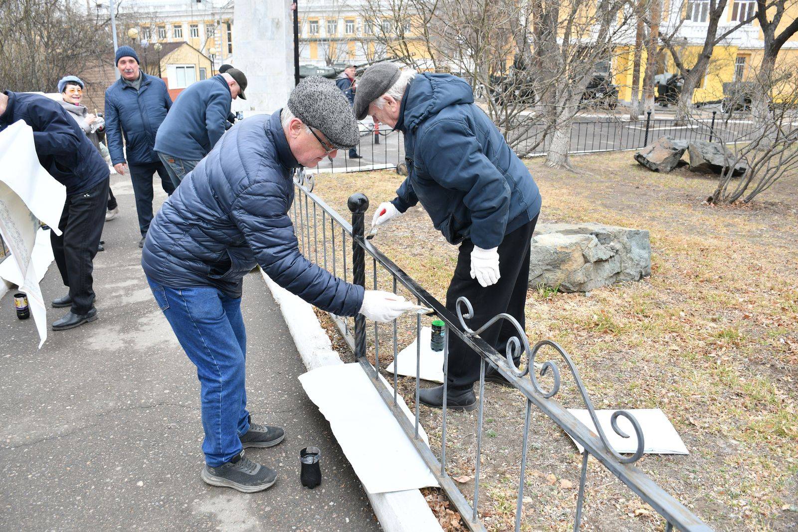 В честь дня рождения Владимира Ильича Ленина в центральном парке столицы Забайкалья ветераны разных отраслей во главе с членом Попечительского совета регионального отделения РВИО, директором ВИЦ «Дом офицеров» Сергеем Жеребцовым провели субботник – очистили территорию, окрасили бордюры и ограждения возле памятника Ленину.