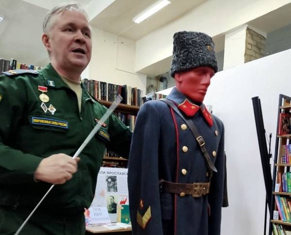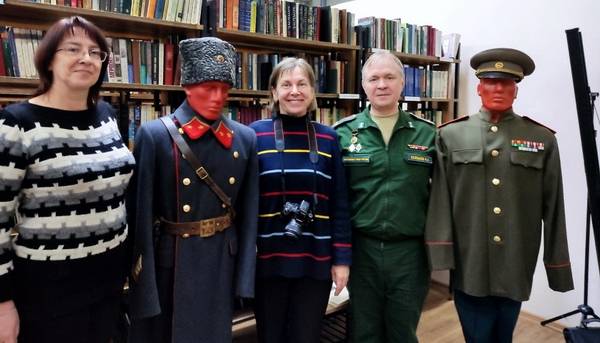 Интересная встреча прошла на прошедшей неделе тоже со студентами Ярославского колледжа культуры. Федор Николаевич представил аудитории пять комплектов формы сухопутных и морских войск: пехотинца, политрука, моряка-офицера, генерала и маршала. Перед участниками встречи развернулась история военного обмундирования в годы Великой Отечественной войны, были представлены предметы «военного быта» - солдатская шинель - скатка, кирзовые сапоги, китель и пальто высшего офицерского состава и др.