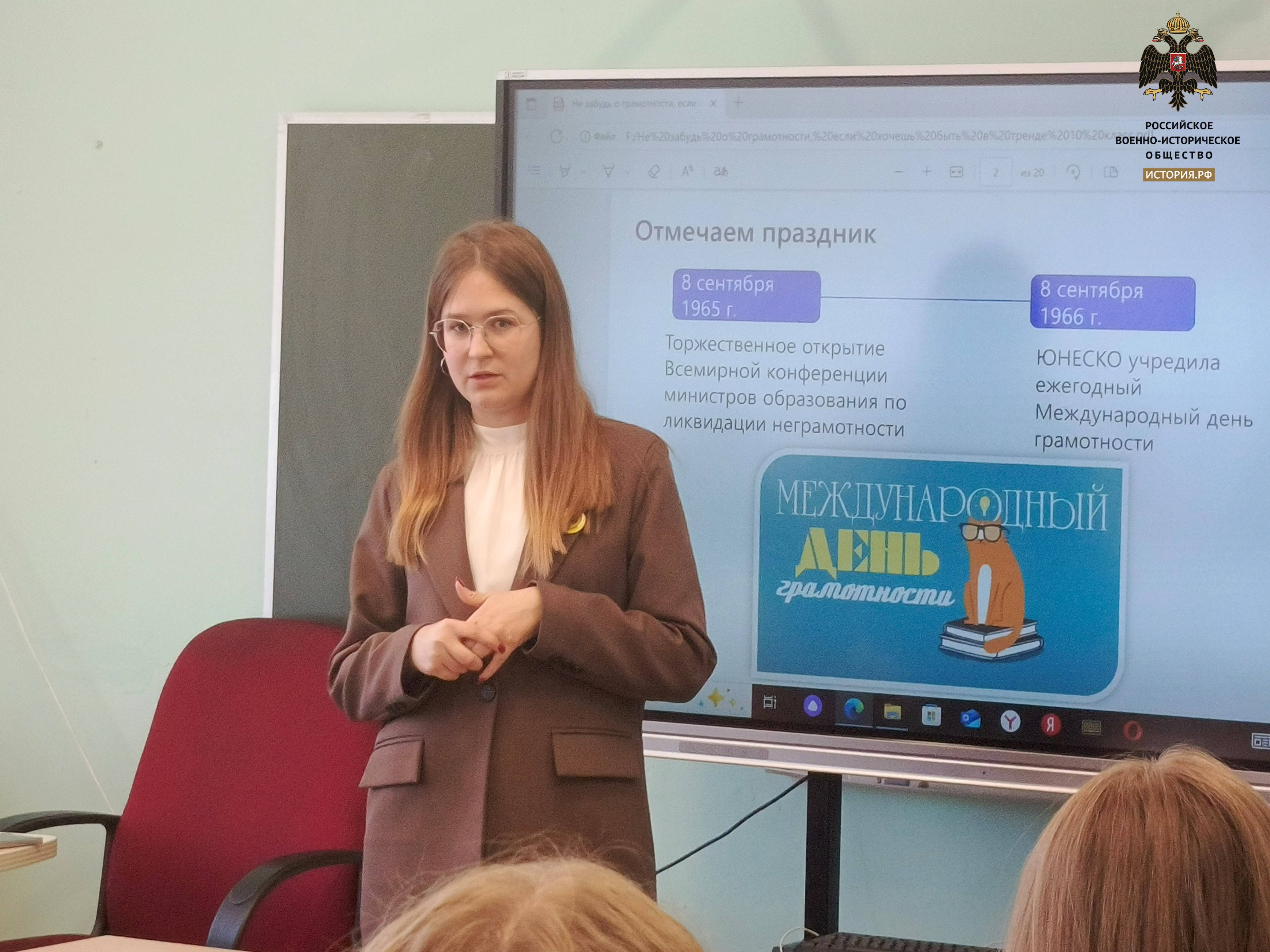8 сентября 2025 года отмечался Международный День грамотности – важная дата, которая напоминает нам о ценности знаний и умений, делающих нашу жизнь полноценнее и насыщеннее. Лектор Российского общества «Знание», член ЯРО РВИО Елизавета Виндилович провела увлекательную и интерактивную лекцию, погрузив учеников 9 и 10 классов в историю возникновения этого значимого события. Она рассказала, как мировое сообщество объединилось ради развития грамотности, ведь именно она – основа личностного роста и успешного будущего.