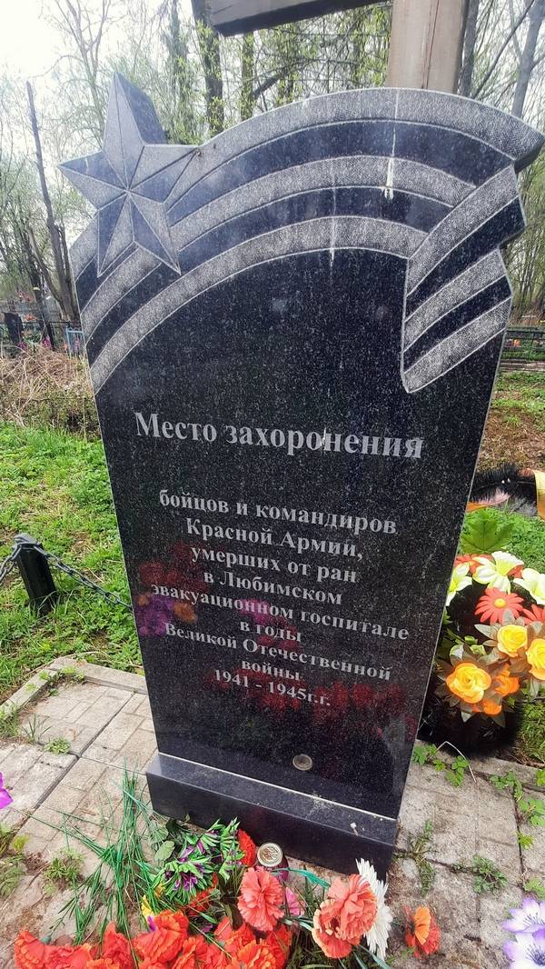 Одним из результатов поездки стало знакомство актива ЯРО РВИО с мемориалом на сельском кладбище Любима, воздвигнутым сравнительно недавно в честь умерших от ран бойцов и командиров Красной Армии, находившихся в эвакогоспиталях №№ 5369 и 4921. Эти госпитали на 400-700 коек располагались в помещениях начальной школы и горсовета с июня 1942 по сентябрь 1943 г.