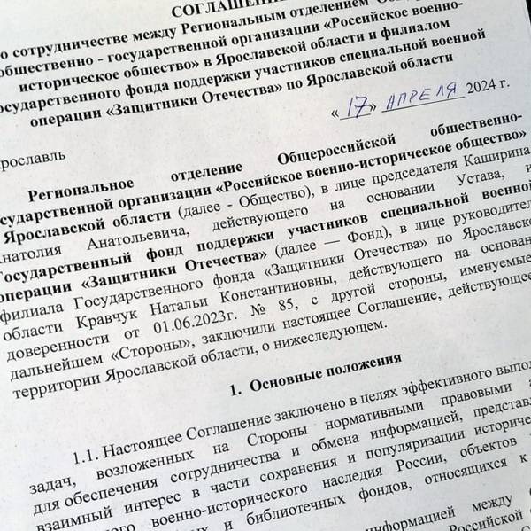 «Мы очень заинтересовано пообщались с руководителем регионального филиала Фонда и до и после церемонии подписания соглашения. – прокомментировал председатель Ярославского регионального отделения Российского военно-исторического общества Анатолий Каширин. – Цель соглашения эффективное выполнение задач, возложенных на наши организации уставными документами и правовыми актами, для обеспечения сотрудничества и обмена информацией, представляющей взаимный интерес в части сохранения и популяризации исторического и культурного военно-исторического наследия России, объектов наследия архивных, музейных и библиотечных фондов, относящихся к военной тематике».