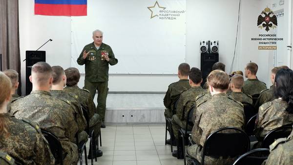 После построения, с кадетами 1 курса прошёл Урок России, который провёл председатель Совета ЯРО РВИО Игорь Ямщиков.