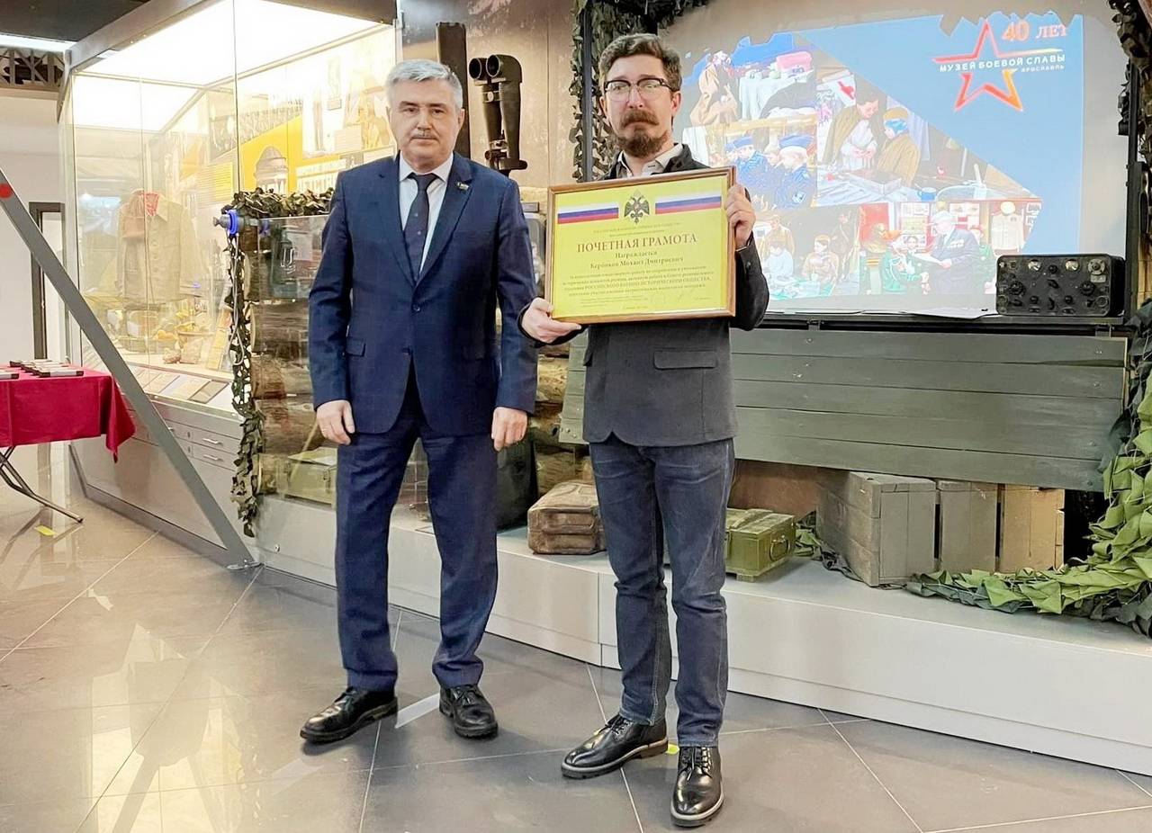 Руководителю Музея, члену Совета ЯРО РВИО Михаилу Кербикову была вручена грамота ЯРО РВИО за многолетнюю и плодотворную работу по сохранению и умножению исторических ценностей региона, активнуюработу в региональном отделении РВИО и деятельное участие в патриотическом воспитании молодёжи.