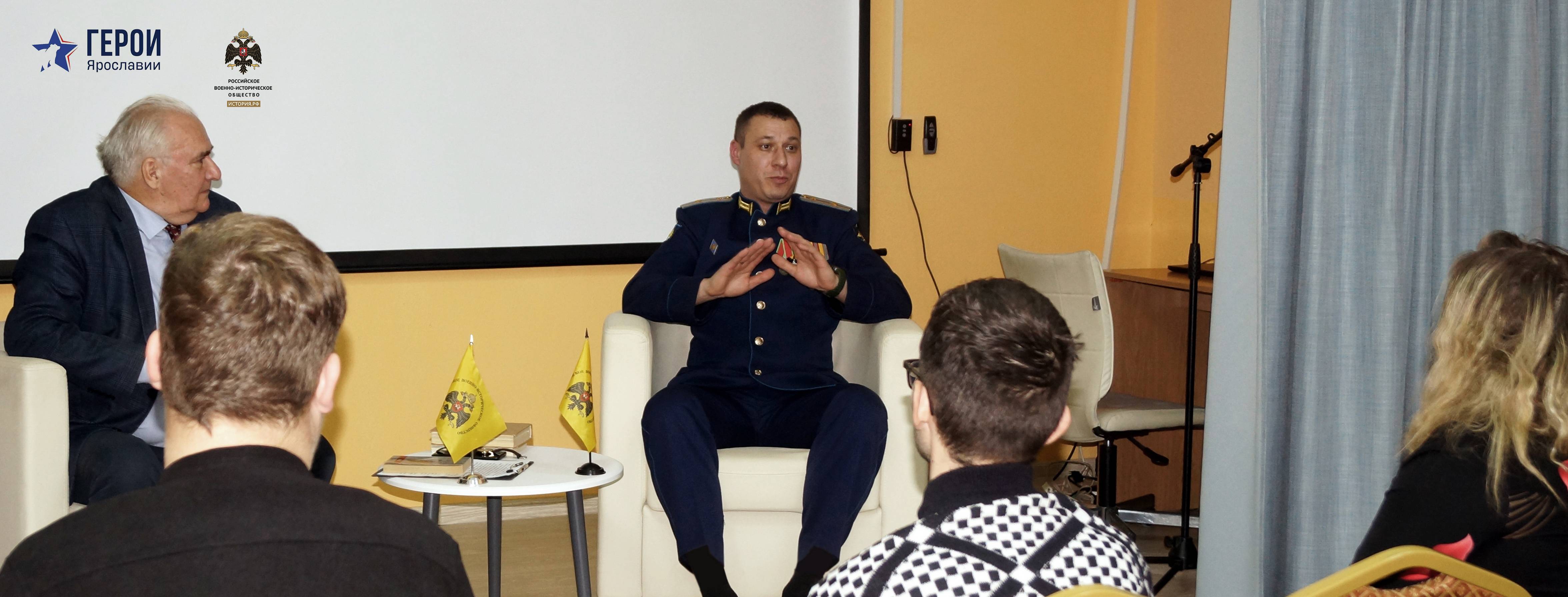 По приглашению Центральной библиотечной сети областного центра участник губернаторского проекта «ГЕРОИ ЯРОСЛАВИИ» Артём Ильич Гаина в рамках общественного проекта «СВО: Семья. Вера. Отечество» встретился с читателями и активом библиотеки. Соорганизатором встречи стало региональной отделение Российского военно-исторического общества в Ярославской области.