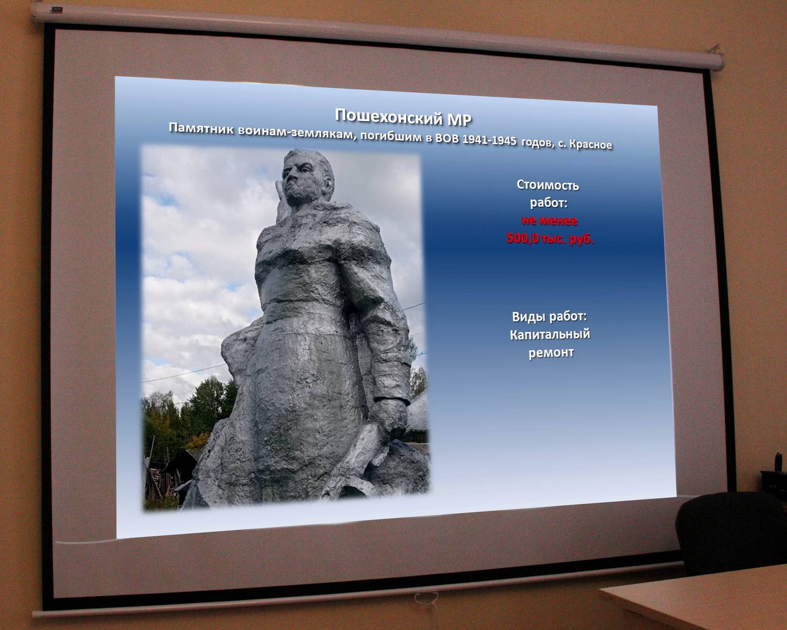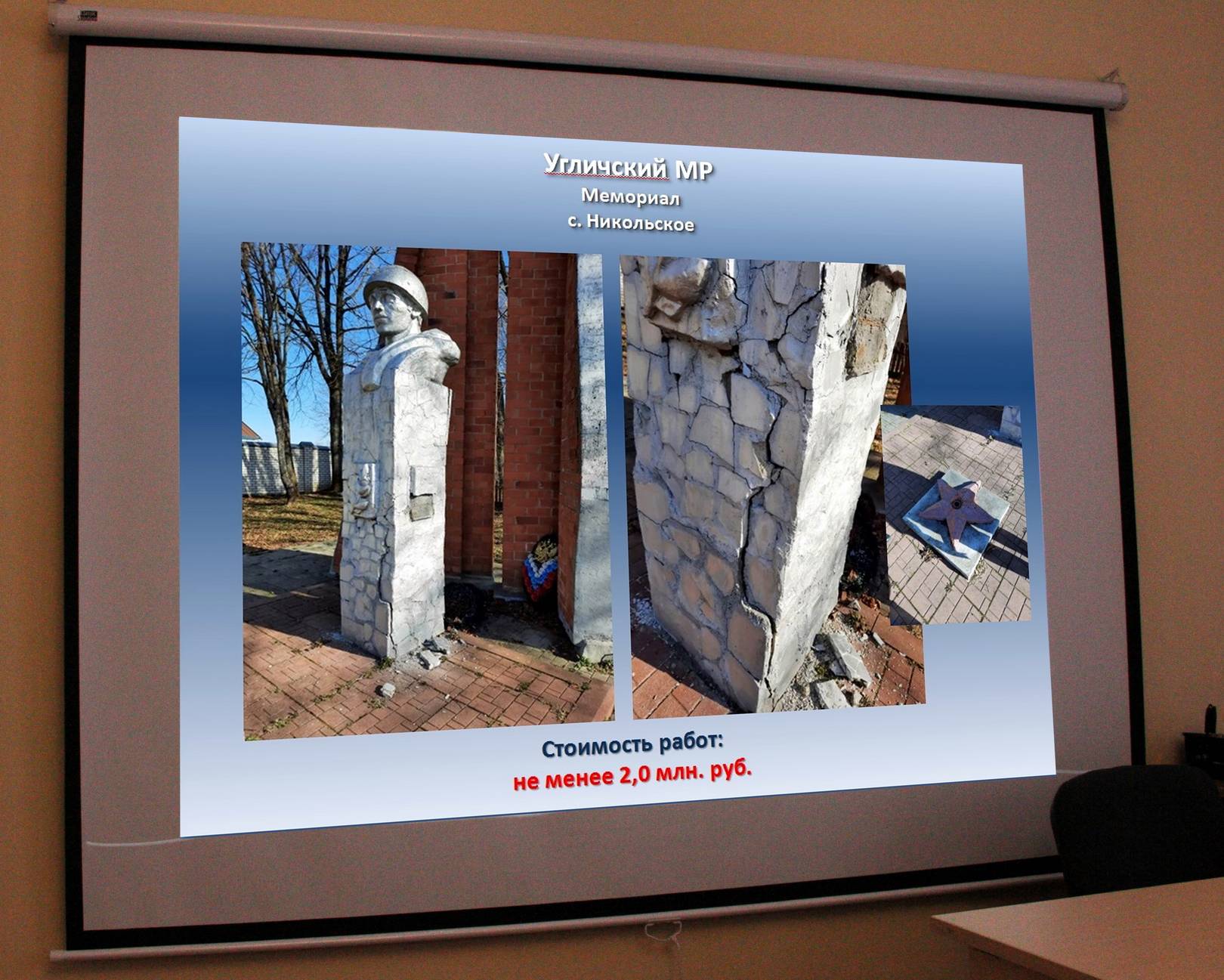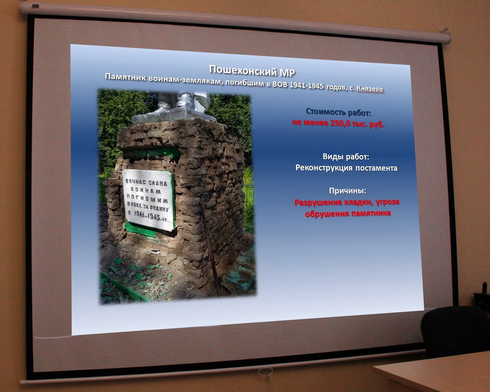 В составе группы - член Совета ЯРО РВИО Игорь Ямщиков, который в отметил в социальных сетях: "Вместе с коллегами из Департамента по делам молодёжи, Департамента территориального развития и представителями ветеранских организаций провели первый заочный этап конкурса на выделение средств из бюджета региона на ремонт и реставрацию мемориалов и воинских захоронений, находящихся в аварийном состоянии. (Справочно: более 70% военно-мемориальных объектов на территории области имеют возраст 55 и более лет). Объективно, честно, непредвзято, со знанием реального положения дел - так мы сегодня рассмотрели все 65 заявок. В ближайшее время комиссия определит наиболее первоочередные памятники, проведёт очные защиты проектов и выедет на места со специалистами в отрасли строительства. Ну и только потом - предложения Губернатору о финансировании работ по конкретным объектам. От себя замечу, что некоторые военно-мемориальные объекты вполне можно было сделать двумя волонтёрами с мешком цемента и песком в тачке. Дольше бумаги составлять, нежели самим взять и сделать без помощи областного бюджета".