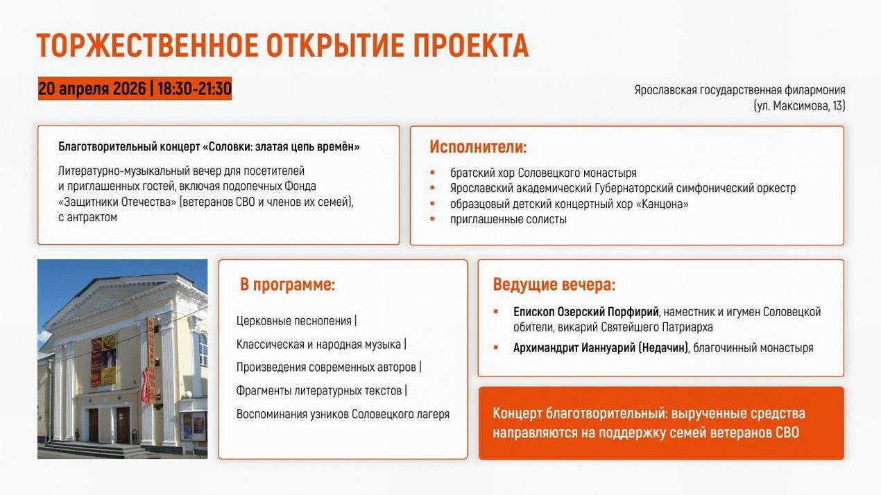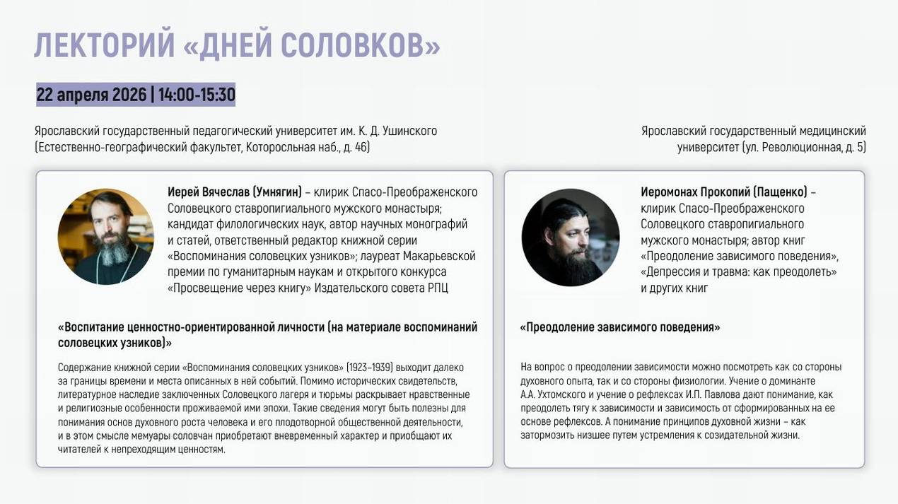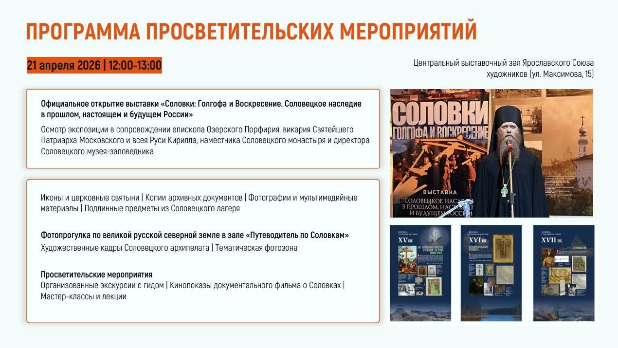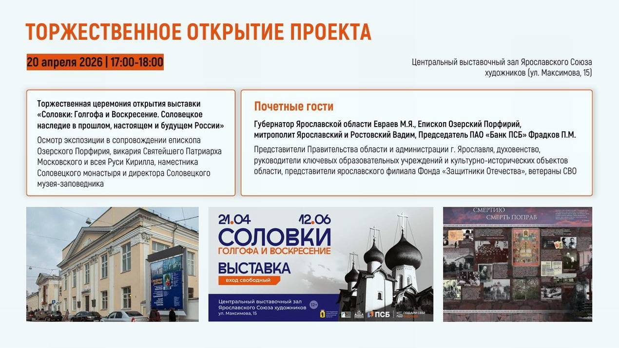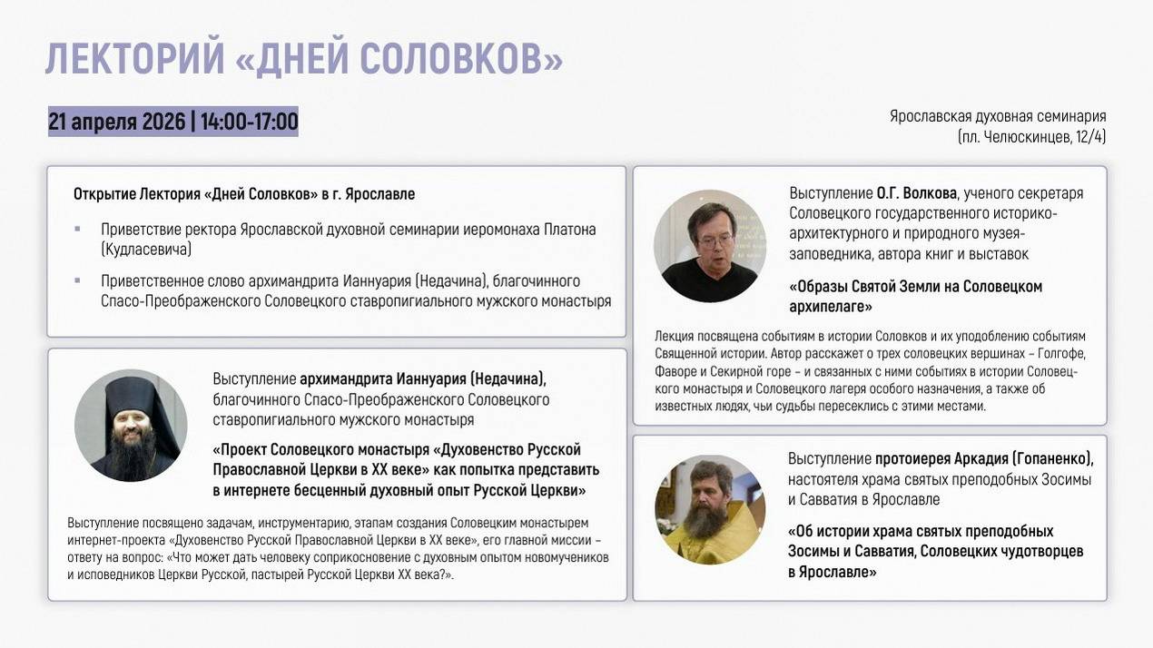 Экспозиция на Первомайском бульваре будет работать до 30 мая. В рамках проекта «Дни Соловков» с 20 апреля по 12 июня также в Ярославле пройдут встречи с представителями Соловецкого монастыря, лекции, кинопоказы, экскурсии и мастер-классы. В конце апреля — благотворительный концерт в ярославской государственной филармонии.